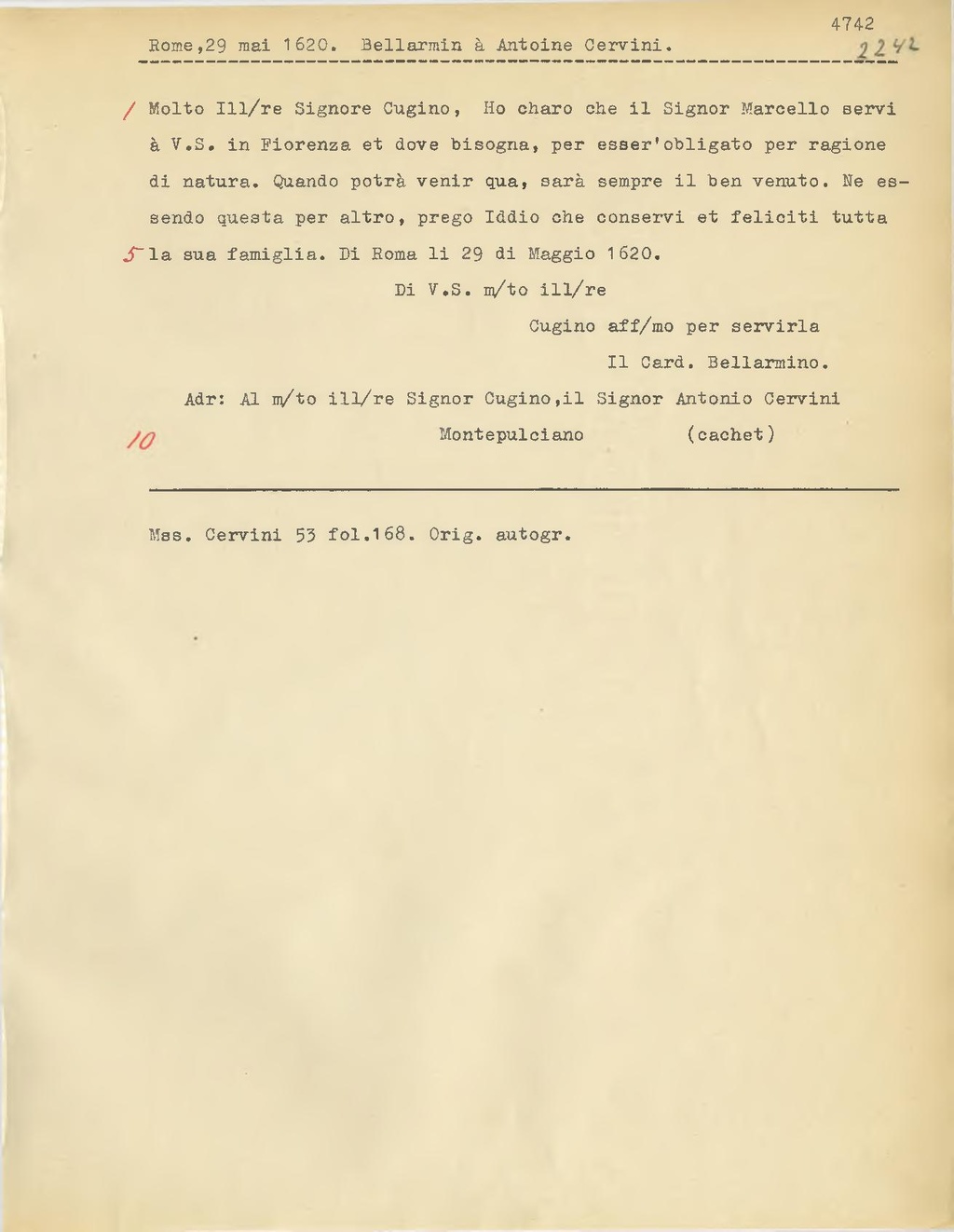 Molto Ill.re Signore Cugino, Ho charo che il Signor Marcello servi à V.S. in Fiorenza et dove bisogna, per esser'obligato per ragione di natura. Quando potrà venir qua, sarà sempre il ben venuto. Ne essendo questa per altro, prego Iddio che conservi et feliciti tutta la sua famiglia. Di Roma li 29 di Maggio 1620.