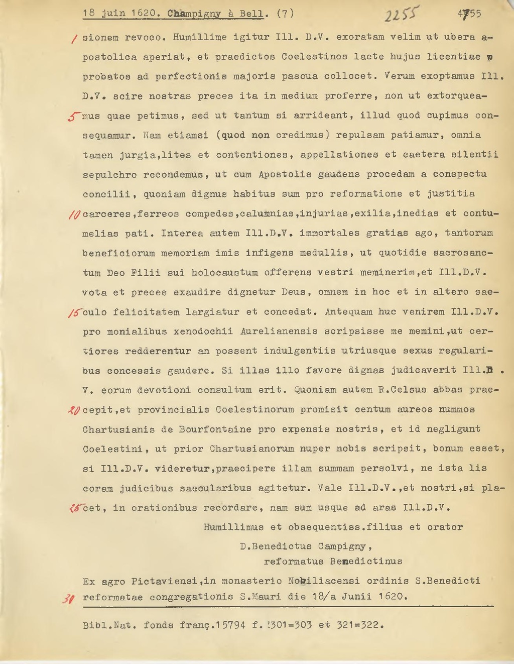 revoco. Humillime igitur Ill. D.V. exoratam velim ut ubera apostolica aperiat, et praedictos Coelestinos lacte hujus licentiae y probatos ad perfectionis majoris pascua collocet. Verum exoptamus Ill. D.V. scire nostras preces ita in medium proferre, non ut extorqueamus quae petimus, sed ut tantum si arrideant, illud quod cupimus consequamur. Nam etiamsi (quod non credimus) repulsam patiamur, omnia tamen jurgia, lites et contentiones, appellationes et caetera silentii sepulchro recondemus, ut cum Apostolis gaudens procedam a conspectu concilii, quondam dignus habitus sum pro reformatione et justitia carceres, ferreos compedes, calumnias, injurias, exilia, inedias et contumelias pati. Interea autem Ill. D.V. immortales gratias ago, tantorum beneficiorum memoriam imis infigens medullis, ut quotidie sacrosanctum Deo Filli sui holocauatum offerens vostri meminerim, et Ill. D.V. vota et preces exaudire dignetur Deus, omnem in hoc et in altero saecoulo felicitatem largiatur et concedat. Antequam huc venirem Ill. D.V. pro monialibus xenodochii Aurelianensis scripsisse me memini, ut certiores redderentur an possent indulgentiis utriusque aexus regularibus concessis gaudere. Si illas illo favore dignas judicaverit Ill. D. V. eorum devotioni consultum erit. Quondam autem R.Celsus abbas praecepit, et provincialis Coelestinorum promisit centum aureos nummos Chartusianis de Bourfontaine pro expensis nostris, et id negligunt Coelestini, ut prior Chartusianorum nuper nobis scripsit, bonum esset, si Ill. D.V. videretur, praecipere illam summam persolvi, ne ista lis coram judicibus saecularibus agitetur. Vale Ill. D.V., et nostri, si placet, in orationibus recordare, nam sum usque ad aras Ill. .D.V.
