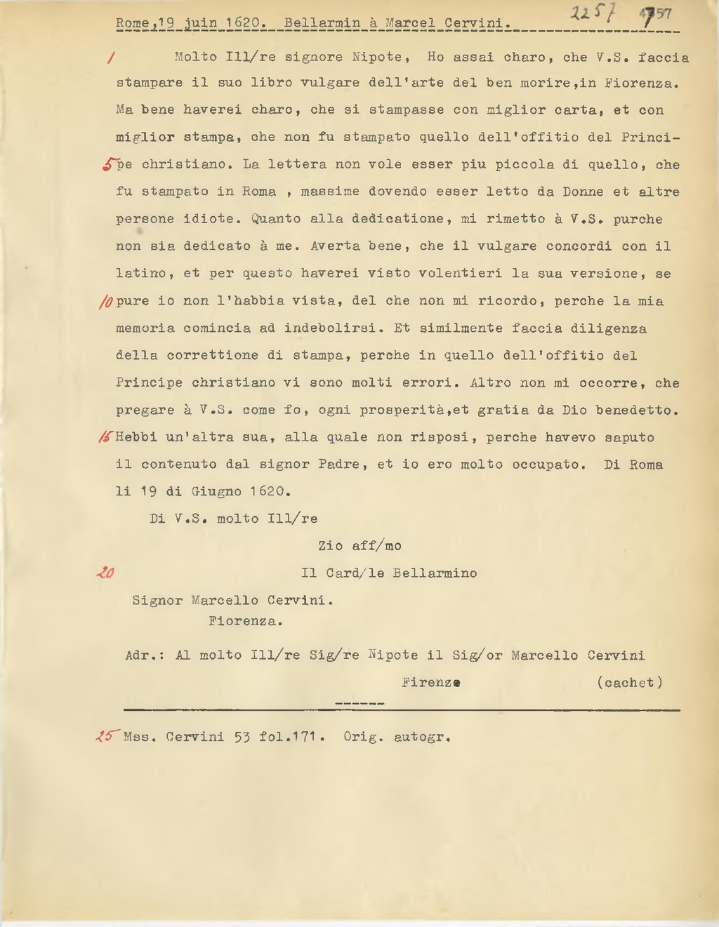 Molto Ill.re signore Nipote, Ho assai charo, che V.S. faccia stampare il suo libro vulgare dell'arte del ben morire, in Fiorenza. Ma bene haverei charo, che si stampasse con miglior carta, et con miglior stampa, che non fu stampato quello dell'offitio del Principe christiano. La lettera non vole esser piu piccola di quello, che fu stampato in Roma , massime dovendo esser letto da Donne et altre persone idiote. Quanto alla dedicazione, mi rimetto à V.S. purchè non sia dedicato à me. Averta bene, che il vulgare concordi con il latino, et per questo haverei visto volentieri la sua versione, se pure io non l'habbia vista, del che non mi ricordo, perche la mia memoria comincia ad indebolirsi. Et similmente faccia diligenza della correttione di stampa, perche in quello dell'offitio del Principe christiano vi sono molti errori. Altro non mi occorre, che pregare à V.S. come fo, ogni prosperità, et gratin da Dio benedetto. Hebbi un'altra sua, alla quale non risposi, perche havevo saputo il contenuto dal signor Padre, et io ero molto occupato. Di Roma li 19 di Giugno 1620.