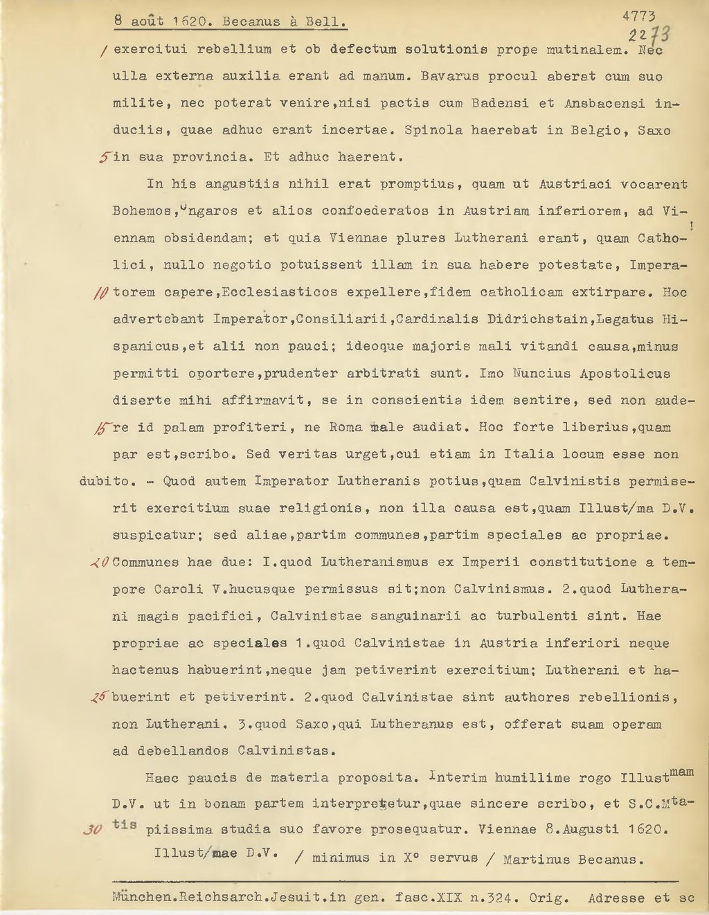 D.V. ut in bonam partem interpretetur, quae sincere scribo, et S.C. M.tatis piissima studia suo favore prosequatur. Viennae 8. Augusti 1620.