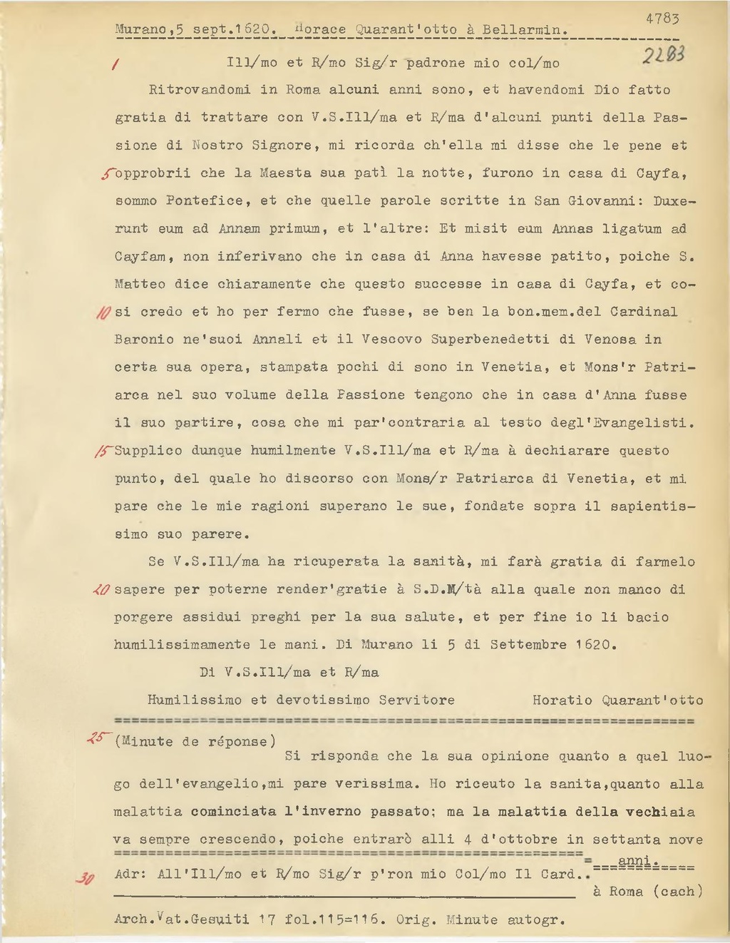 Ritrovandomi in Roma alcuni anni sono, et havendomi Dio fatto gratia di trattare con V.S. Ill.ma et R.a d'alcuni punti della Passione di Nostro Signore, mi ricorda ch'ella mi disse che le pene et opprobrii che la Maestà sua patì la notte, furono in casa di Cayfa, sommo Pontefice, et che quelle parole scritte in San Giovanni: Duxerunt eum ad Annam primum, et l'altre: Et misit eum Annas ligatum ad Cayfam, non inferivano che in casa di Anna havesse patito, poichè S. Matteo dice chiaramente che questo successe in casa di Cayfa, et cosi credo et ho per fermo che fusse, se ben la bon.mem. del Cardinal Baronio ne'suoi Annali et il Vescovo Superbenedetti di Venosa in certa sua opera, stampata pochi di sono in Venetia, et Mons'r Patriarca nel suo volume della Passione tengono che in casa d'Anna fusse il suo partire, cosa che mi par'contraria al testo degl'Evangelisti. Supplico dunque humilmente V.S. Ill.ma et R.ma à dechiarare questo punto, del quale ho discorso con Mons.r Patriarca di Venetia, et mi pare che le mie ragioni superano le sue, fondate sopra il sapientissimo suo parere.