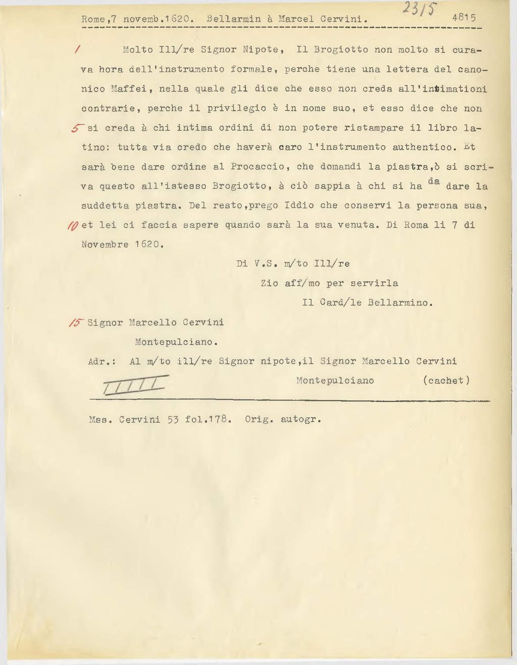 Molto Ill.re Signor Nipote, Il Brogiotto non molto si curava hora dell'instrumento formale, perche tiene una lettera del canonico Maffei, nella quale gli dice che esso non creda all'intimationi contrarie, perche il privilegio è in nome suo, et esso dice che non si creda à chi intima ordini di non potere ristampare il libro latino: tutta via credo che bavera caro l'instrumento authentico. Et sarà bene dare ordine al Procaccio, che domandi la piastra, ò si scriva questo all'istesso Brogiotto, à ciò sappia à chi si ha da dare la suddetta piastra. Del resto, prego Iddio che conservi la persona sua, et lei ci faccia sapere quando sarà la sua venuta. Di Roma li 7 di Novembre 1620.