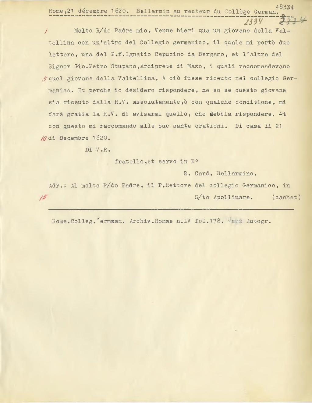 Molto R.do Padre mio, Venne hieri qua un giovane della Valtellina con un'altro del Collegio germanico, il quale mi portò due lettere, una del P.f. Ignatio Capucino da Bergamo, et l'altra del Signor Gio. Petro Stupano, Arciprete di Mazo, i quali raccomandavano quel giovane della Valtellina, à ciò fusse riceuto nel collegio Germanico. Et perche io desidero rispondere, ne so se questo giovane sia riceuto dalla R.V. assolutamente, ò con qualche conditione, mi farà gratia la R.V. di avisarmi quello, che debbia rispondere, con questo mi raccomando alle sue sante orationi. Di casa li 21 di Decembre 1620.