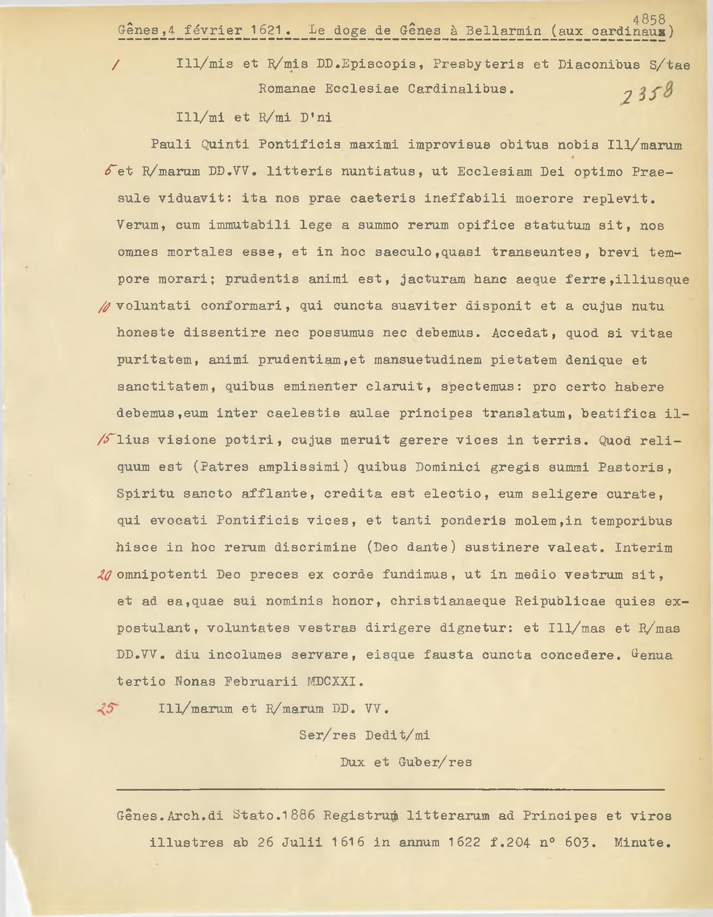 Pauli Quinti Pontificie maximi improvisus obitus nobis Ill.marum et R.marum DD.VV. littorie nuntiatus, ut Ecclesiam Dei optimo Praesule viduavit: ita nos prae caeteris ineffabili moerore replevit. Verum, cum immutabili lega a summo rerum opifice statutum sit, nos omnes mortales esse, et in hoc saeculo, quasi transeuntes, brevi tempore morari; prudentis animi est, jacturam hanc aeque ferro, illiusque voluntati conformari, qui cuncta suaviter disponit et a cujus nutu honeste dissentire nec possumus nec debemus. Accedat, quod si vitae puritatem, animi prudentiam, et mansuetudinem pietatem denique et sanctitatem, quibus eminenter claruit, spectemus: pro certo habere debemus, eum inter caelestis aulae principes translatum, beatifica illius visione potiri, cujus meruit gerere vices in terris. Quod reliquum est (Patres amplissimi) quibus Dominici gregis summi Pastoris, Spirita sanato afflante, eredita est electio, eum seligere curate, qui avocati Pontificie vices, et tanti ponderis molem, in temporibus hisce in hoc rerum discrimine (Deo dante) sustinere valeat. Interim omnipotenti Deo preces ex corde fundimus, ut in medio vestrum sit, et ad ea, quae sui nominis honor, christianaeque Reipublicae quies expostulant, voluntates vestras dirigere dignetur: et Ill.mas et R.mas DD.VV. diu incolumes servare, eisque fausta cuncta concedere. Genua tertio Nonas Februarii MDCXXI.