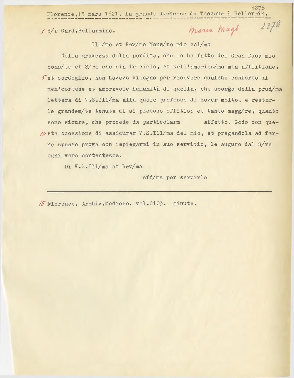 Nella gravezza della perdita, che io ho fatto del Gran Duca mio cons.te et S.re che sia in cielo, et nell'amariss.ma mia afflitione, et cordoglio, non havevo bisogno per ricevere qualche conforto di men' cortese et amorevole humanità di quella, che scorgo della prud.ma lettera di V.S. Ill.ma alla quale professo di dover molto, e restarle grandem.te tenuta di si pietoso offitio; et tanto magg.re, quanto sono sicura, che procede da particolarm... affetto. Godo con questa occasione di assicurar V.S. Ill.ma del mio, et pregandola ad farne spesso prova con impiegarmi in suo servitio, le auguro dal S.re ogni vera contentezza.