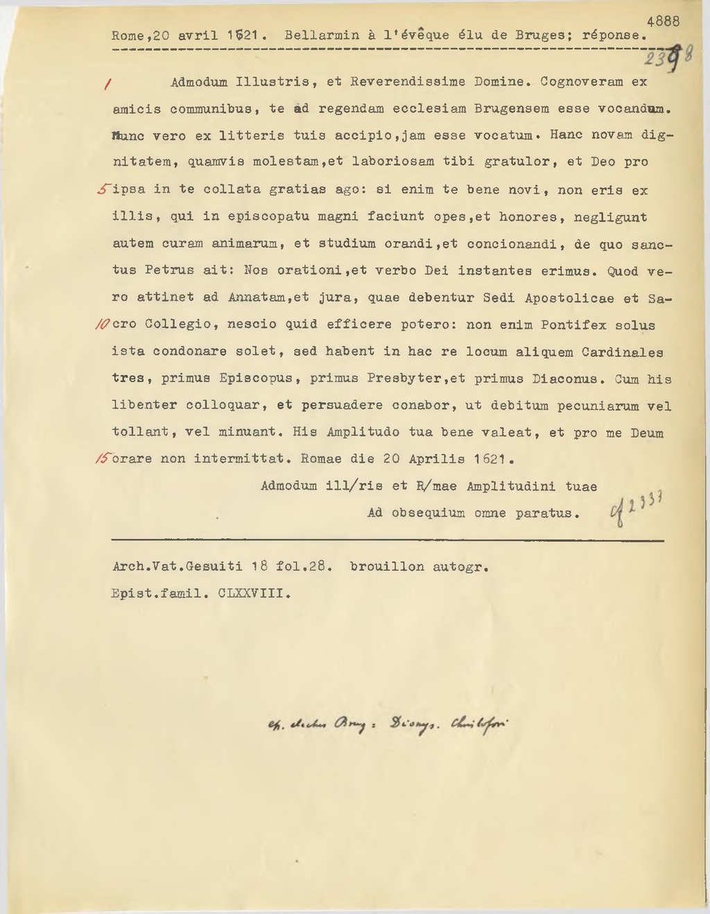 Admodum Illustris, et Reverendissime Domine. Cognoveram ex amicis communibus, te ad regendam ecclesiam Brugensem esse vocandam. Munc vero ex litteris tuis accipio,jam esse vocatum. Hanc novam dignitatem, quamvis molestam, et laboriosam tibi gratular, et Deo pro ipsa in te collata gratias ago: si enim te bene novi, non eris ex illis, qui in episcopatu magni faciunt opes, et honores, negligunt autem curam animarum, et studium orandi, et concionandi, de quo sanctus Petrus alt: Nos orationi, et verbo Dei instantes erimus. Quod vero attinet ad Annatam, et jura, quae debentur Sedi Apostolicae et Sacro Collegio, nescio quid efficere potere: non enim Pontifex solus ista condonare solet, sed habent in hac re locum aliquem Cardinales tres, primus Episcopus, primus Presbyter, et primus Diaconus. Cum his libenter colloquar, et persuadere conabor, ut debitum pecuniarum vel tollant, vel minuant. His Amplitudo tua bene valeat, et pro me Deum