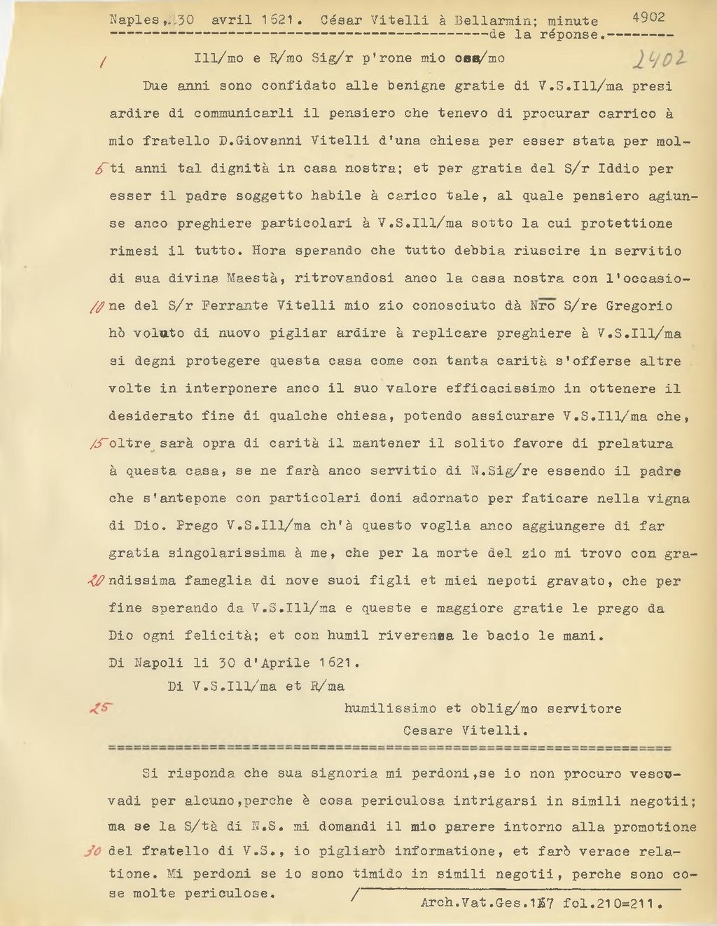 Si risponda che sua signoria mi perdoni,se io non procuro vescovadi per alcuno, perche è cosa periculosa intrigarsi in simili negotii; ma se la S.tà di N.S. mi domandi il mio parere intorno alla promotione del fratello di V.S., io pigliarò informatione, et farò verace relatione. Mi perdoni se io sono timido in simili negotii, perche sono cose molte periculose.