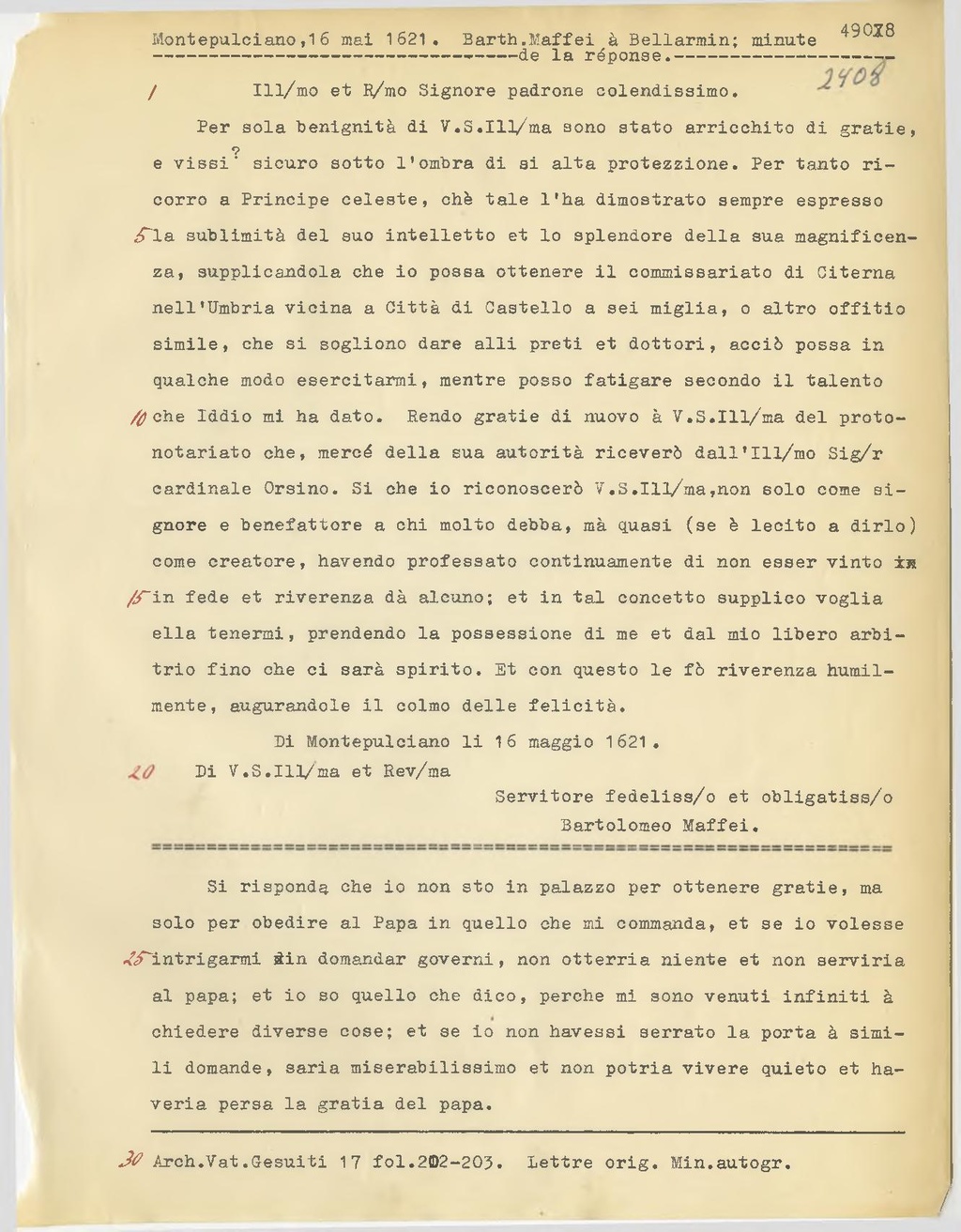 Per sola benignità di V.S. Ill.ma sono stato arricchito di gratie, e vissi sicuro sotto l'ombra di si alta protezzione. Per tanto ricorro a Principe celeste, chè tale l'ha dimostrato sempre espresso la sublimità del suo intelletto et lo splendore della sua magnificenza, supplicandola che io possa ottenere il commissariato di Citerna nell'Umbria, vicina a Città di Castello a sei miglia, o altro offitio simile, che si sogliono dare alli preti et dottori, acciò possa in qualche modo esercitarmi, mentre posso fatigare secondo il talento che Iddio mi ha dato. Rendo gratie di nuovo à V.S. Ill.ma del proto notariato che, mercè della sua autorità riceverà dall'Ill.mo Sig.r cardinale Orsino. Si che io riconoscerò V.S. Ill.ma,non solo come signore e benefattore a chi molto debba, mà quasi (se è lecito a dirlo) come creatore, havendo professato continuamente di non esser vinto in fede et riverenza dà alcuno; et in tal concetto supplico voglia ella tenermi, prendendo la possessione di me et dal mio libero arbitrio fino che ci sarà spirito. Et con questo le fò riverenza humilmente, augurandole il colmo delle felicità.