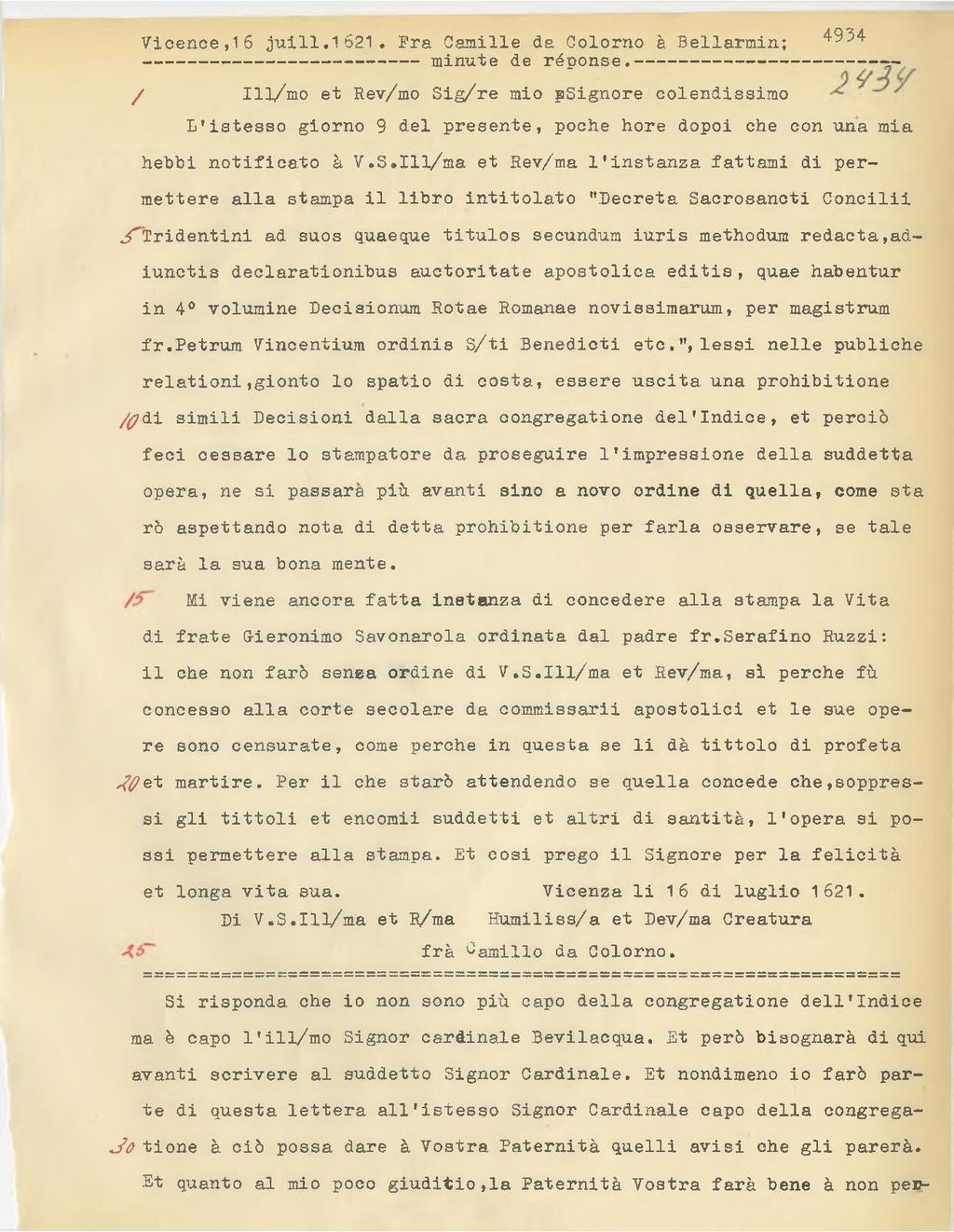 Mi viene ancora fatta instanza di concedere alla stampa la Vita di frate Gieronimo Savonarola[1] ordinata dal padre fr. Serafino Ruzzi: il che non farò senza ordine di V.S. Ill.ma et Rev.ma, sì perche fù concesso alla corte secolare da commissarii apostolici et le sue opere sono censurate, come perche in questa se li dà tittolo di profeta et martire. Per il che starà attendendo se quella concede che, soppressi gli tittoli et encomii suddetti et altri di santità, l'opera si possi permettere alla stampa. Et cosi prego il Signore per la felicità et longa vita sua.
