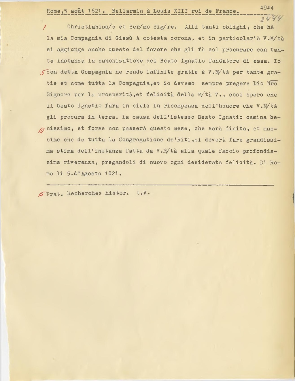 Christianiss.o et Ser.mo Sig.re. Alli tanti oblighi, che hà la mia Compagnia di Giesù à cotesta corona, et in particolar'à V. M.tà si aggiunge ancho questo del favore che gli fà col procurare con tanta instanza la canonizatione del Beato Ignatio fondatore di essa. Io con detta Compagnia ne rendo infinite gratie à V. M.tà per tante gratie et come tutta la Compagnia,et io devemo sempre pregare Dio N.ro Signore per la prosperità, et felicità della M.tà V., cosi spero che il beato Ignatio fara in cielo in ricompensa dell'honore che V. M.tà gli procura in terra. La causa dell'istesso Beato Ignatio camina benissimo, et forse non passerà questo mese, che sarà finita, et massime che da tutta la Congregatione de'Riti, si doverà fare grandissima stima dell'instanza fatta da V. M.tà alla quale faccio profondissima riverenza, pregandoli di nuovo ogni desiderata felicità. Di Roma li 5. d'Agosto 1621.