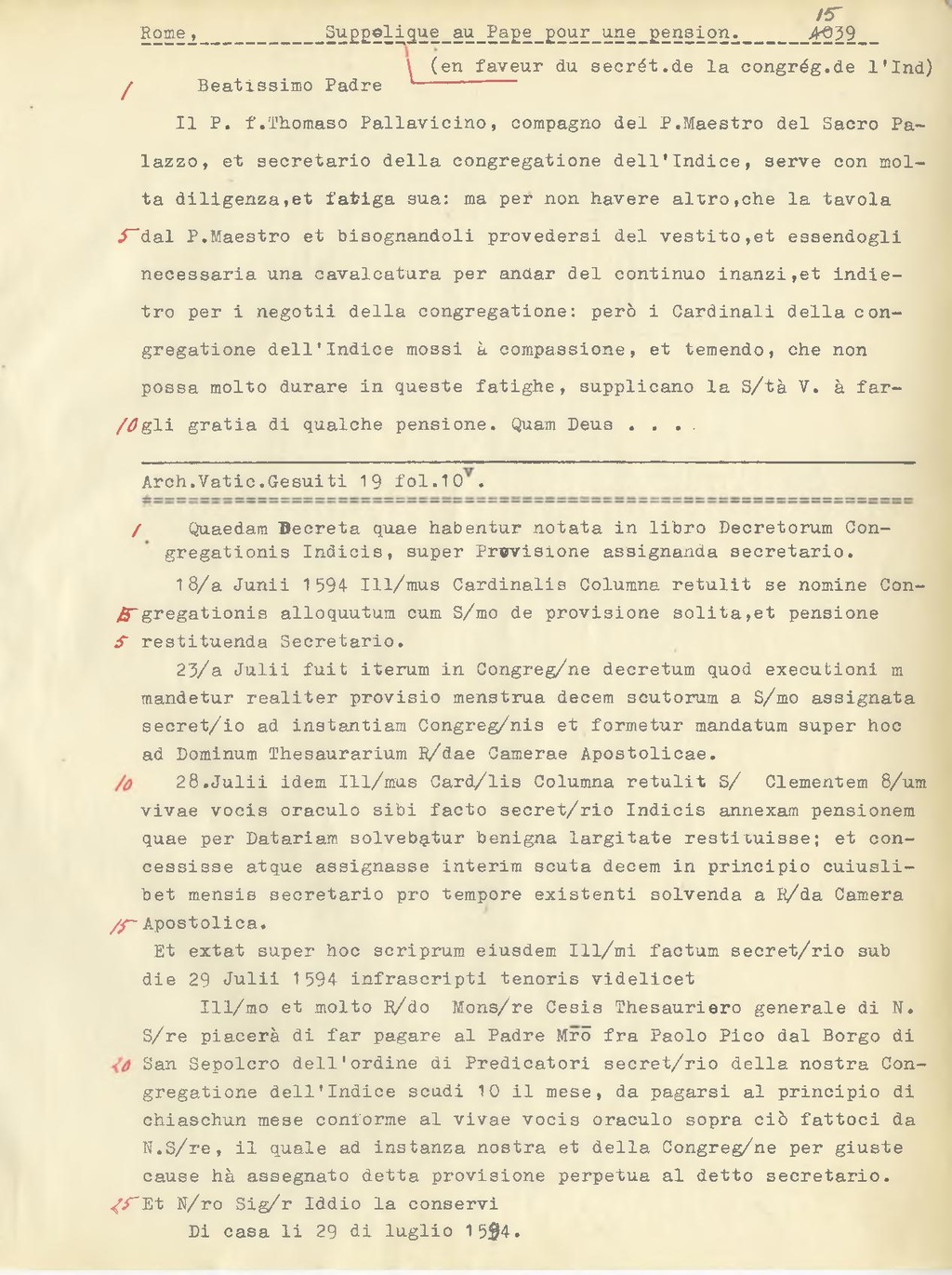 Il P. f. Thomaso Pallavicino, compagno del P.Maestro del Sacro Palazzo, et secretario della congregatione dell'Indice, serve con molta diligenza, et fatiga sua: ma per non havere altro, che la tavola dal P. Maestro et bisognandoli provedersi del vestito, et essendogli necessaria una cavalcatura per andar del continuo inanzi, et indietro per i negotii della congregatione: però i Cardinali della congregatione dell'Indice mossi à compassione, et temendo, che non possa molto durare in queste fatighe, supplicano la S.tà V. à fargli gratia di qualche pensione. Quam Deus . . . .