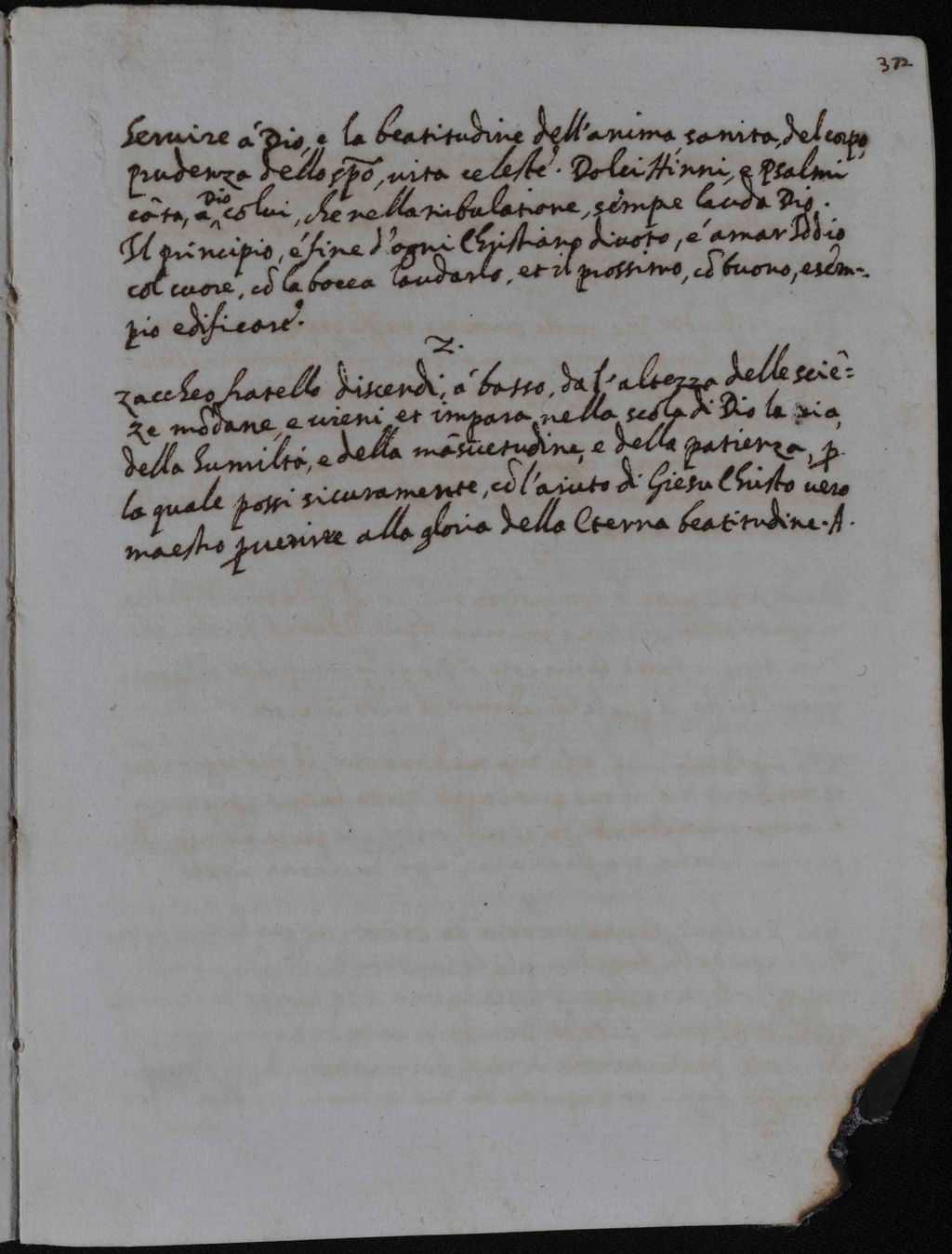 Zaccheo fratello dicendi, a basso, da l'altezza delle scienze mondane, et vieni et impara nella scola di Dio la via della humilità, e della mansuetudine e della patienza per la quale possi sicuramente ed l'aiuto di Giesù Christo vero maestro pervenire alla gloria della Eterna beatitudine. Amen