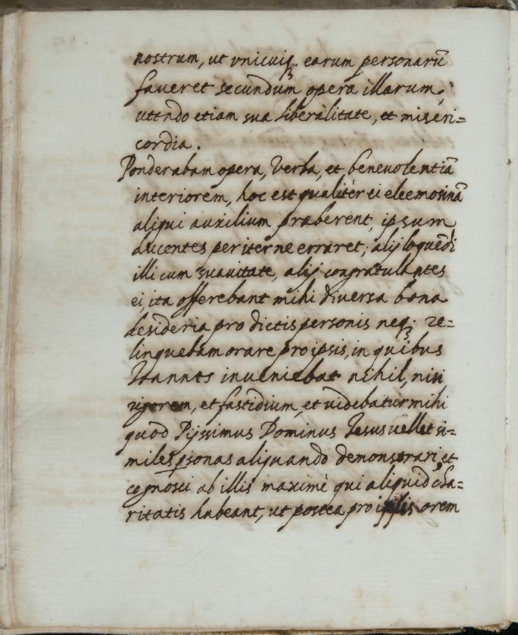 Ponderabam[2] opera[3], verba, et benevolentiam interiorem, hoc est qualiter[4] ei eleemosinam aliqui auxilium praeberent[5], ipsum ducentes[6] per iter ne erraret; alii loquendi[7] illi cum suavitate, alii congratulantes ei, et ita offerebant[8] mihi diversa bona desideria pro dictis personis neque relinquebam orare pro ipsis, in quibus Ioannes[9] inveniebat nihil[10], nisi rigorem, et fastidium, et videbatur mihi quod piissimus Dominus[11] Iesus vellet[12] similes personas aliquando demonstrari, et cognosci ab illis maxime qui aliquid charitatis habeant[13], ut postea pro ipsis orem[14],