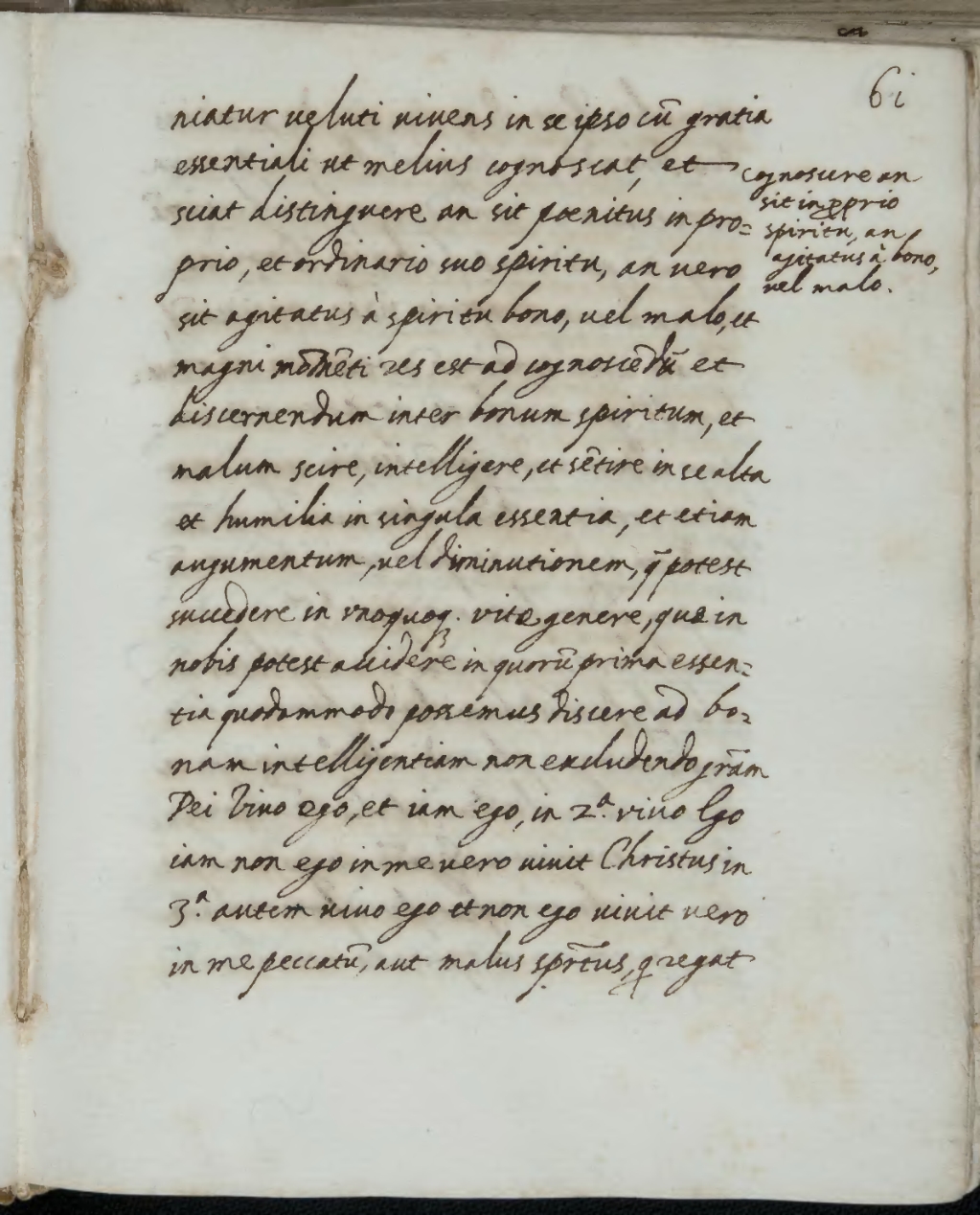 niatur [inveniatur] veluti vivens in se ipso cum gratia essentiali ut melius Cognoscere an sit in proprio spiritu, an agitatus a bono, vel malo. cognoscat, et sciat distinguere an sit poenitus in proprio, et ordinario suo spiritu, an vero sit agitatus a spiritu bono, vel malo[1], et magni momenti res est ad cognoscendum et discernendum inter bonum spiritum, et malum scire, intelligere, et sentire in se alta et humilia in singula essentia[2], et etiam augumentum, vel diminutionem, quae potest succedere in unoquoque vitae genere, quae in nobis potest accidere in quorum[3] prima essentia[4] quodammodo possemus discere[5] ad bonam intelligentiam non excludendo gratiam Dei: Vivo ego, et iam ego. In 2a. "Vivo ego iam[6] non ego in me vero vivit[7] Christus"[I] in 3a. autem: vivo ego et non[8] ego, vivit vero in me peccatum, aut malus spiritus, qui regat[9]