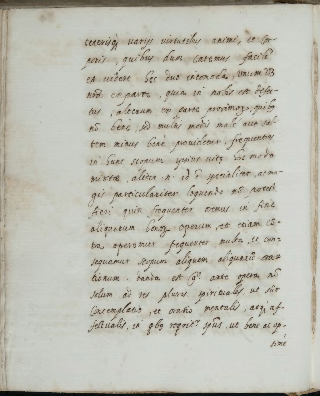 caeterisque variis virtutibus animi, et corporis, quibus dum caremus facile est videre haec duo incomoda, unum videlicet nostra ex parte, quia in nobis est[1] defectus[2], alterum ex parte proximorum, quibus non bene, sed multis modis male aut saltem minus bene[3] providetur, frequentius[4] in hunc scopum[5] ipsius vitae hoc modo mixtae, aliter enim id est specialiter, ac[6] magis particulariter loquendo non potest fieri quin frequenter oremus in fine[7] aliquorum bonorum operum, et etiam contra operemur frequenter[8] multa, et[9] consequamur scopum aliquem aliquarum orationum. Danda est igitur[10] ante opera[11] non solum ad res pluris[12] spirituales, ut sunt contemplatio, et oratio mentalis, atque affectualis, in quibus[13] requiritur[14] spiritus[15], ut bene ac op=
