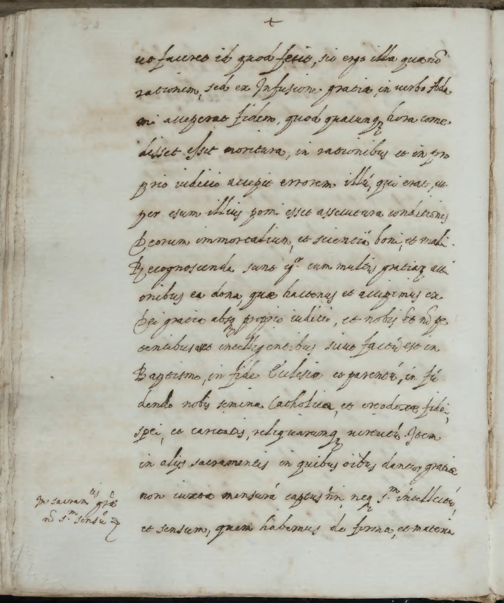 et accepimus ex Dei gratia absque proprio iudicio, et nobis etiam non petentibus aut intelligentibus sicut factum est in Baptismo, in fide Ecclesiae et parentum, infundendo nobis semina Catholicae, et ort[h]odoxae fidei, spei, et caritatis, reliquarumque virtutum.