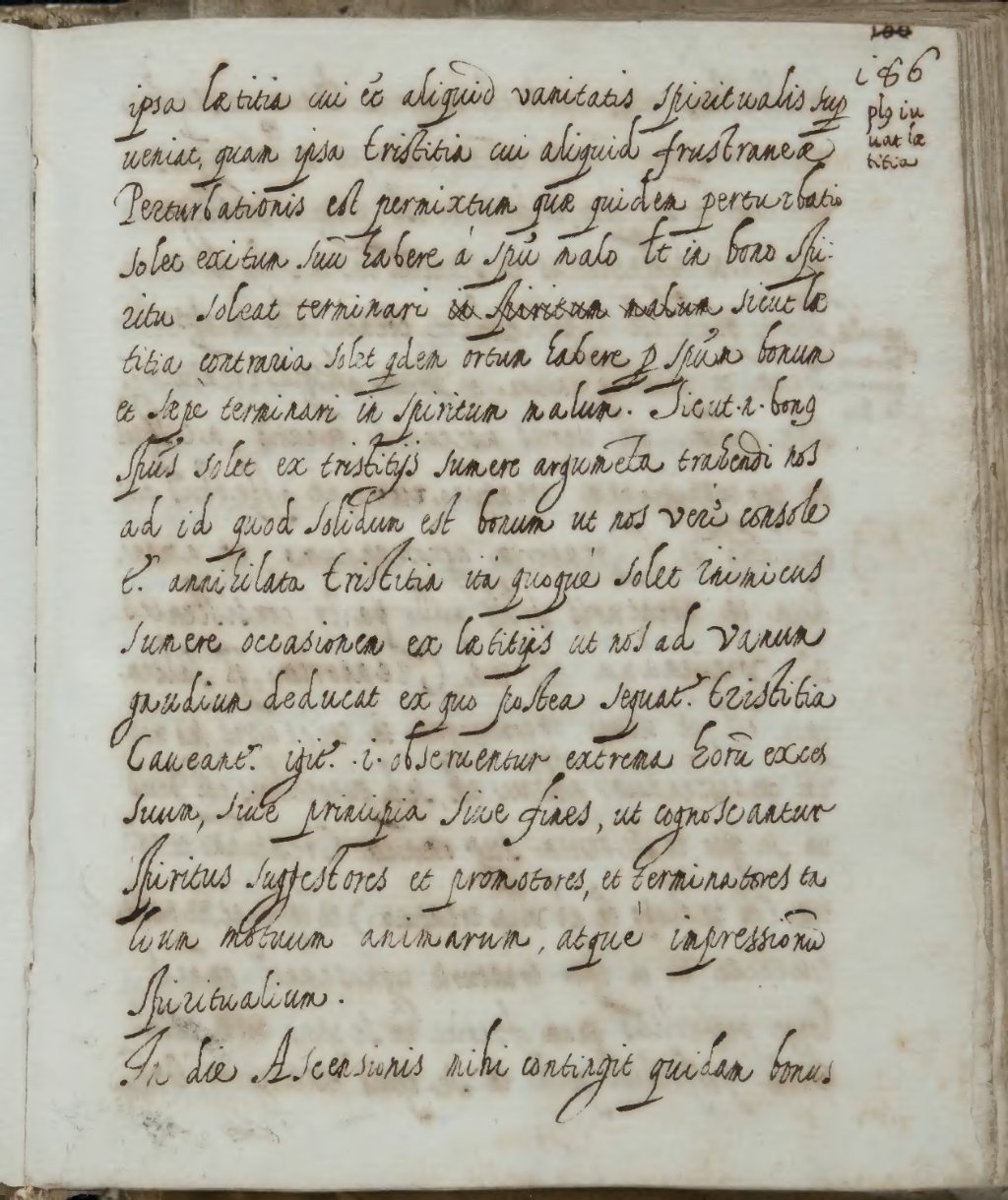 plus iuvat laetitia ipsa laetitia cui etiam aliquid vanitatis spiritualis superveniat, quam ipsa tristitia cui aliquid frustraneae Perturbationis est permixtum quae quidem perturbatio solet exitum[1] suum habere a spiritu malo[2] licet in bono Spiritu[3] soleat terminari in spirit malum[a] sicut laetitia contraria solet quidem ortum habere per spiritum bonum et saepe terminari in spiritum malum. Sicut enim bonus spiritus solet ex tristitiis sumere argumenta trahendi nos ad id quod solidum est bonum ut nos vere consoletur annihilata tristitia[4] ita quoque solet inimicus sumere occasionem ex laetitiis ut nos ad vanum gaudium deducat ex quo postea sequatur tristitia. Caveantur igitur id est observentur extrema horum excessuum, sive principia sive fines, ut cognoscantur Spiritus suggestores et promotores, et terminatores talium motuum animarum[5], atque impressionum spiritualium.