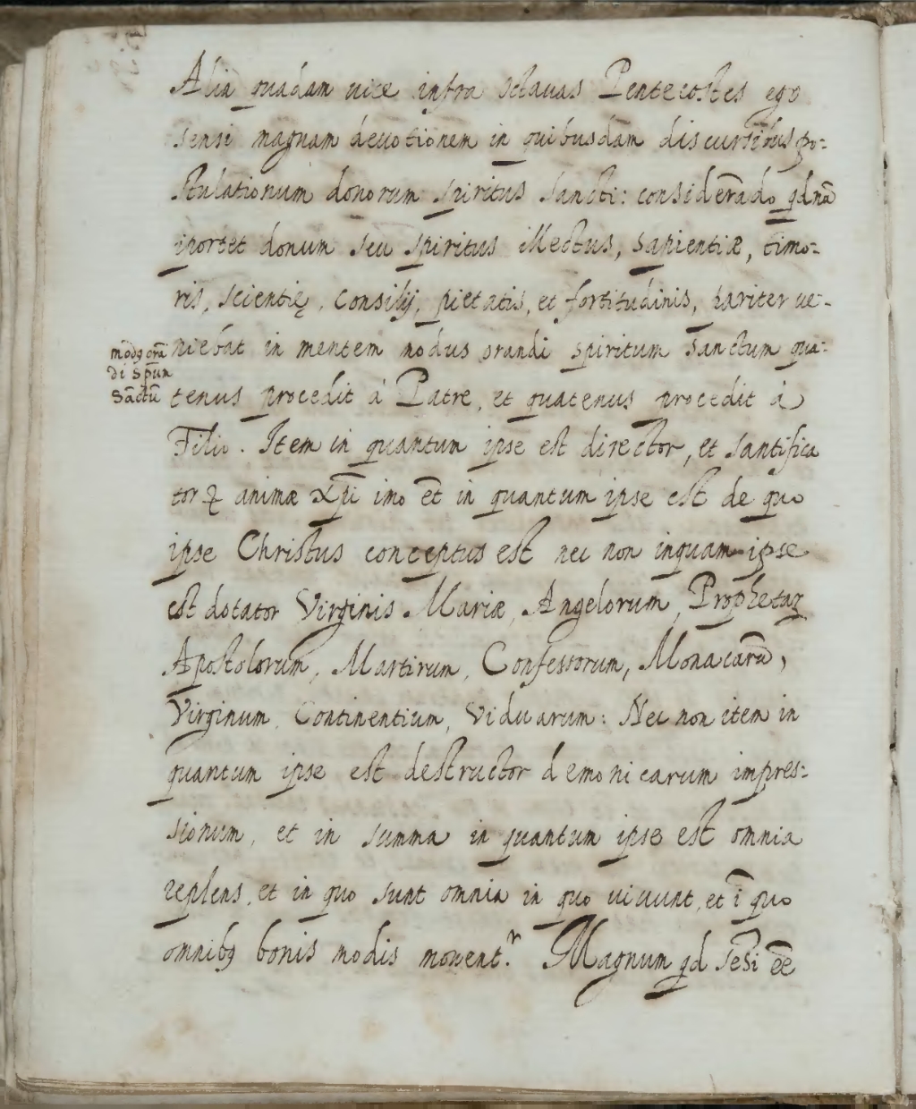 Alia quadam vice infra octavas Pentecostes ego sensi magnam devotionem in quibusdam discursibus postulationum donorum Spiritus Sancti: considerando quidnam i[m]portet donum seu spiritus