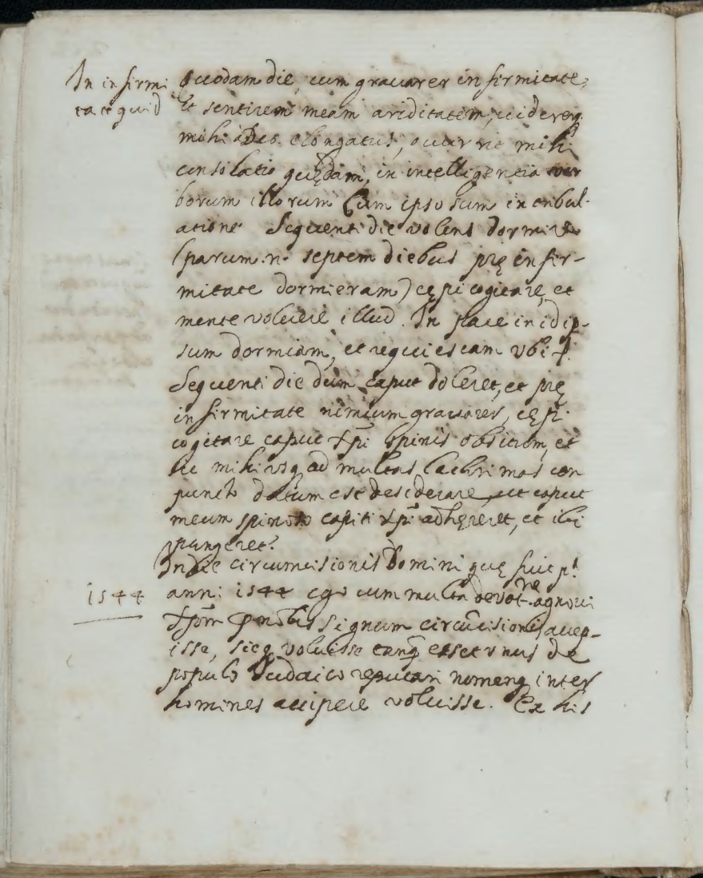 In die circumcisionis Domini quae fuit prima anni 1544 1544 ego cum multa devotione agnovi Christum pro nobis signum circumcisionis[7] accepisse, sicque voluisse tanquam esset unus de populo Iudaico reputari nomenque[8] inter homines accipere voluisse[9]. Ex his