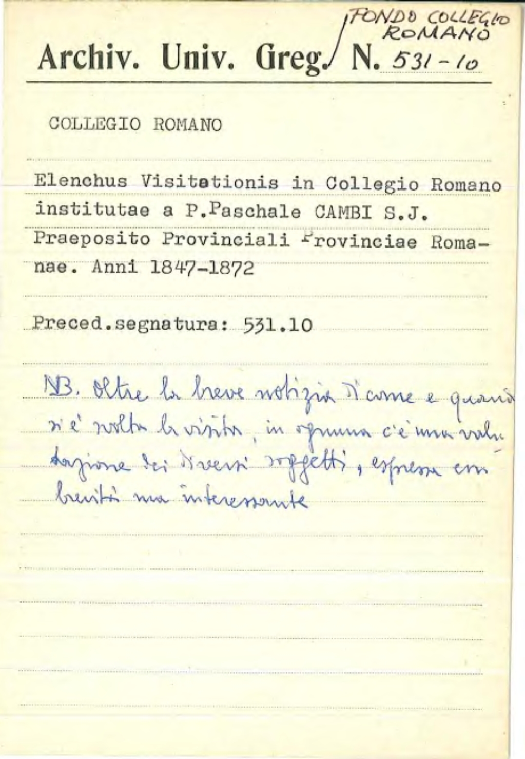 Fotocopie di originali da cercare, dal titolo “Elenchus Visitationis in Collegio Romano institutae a P. Paschale Cambi S.J. Praeposito Provinciali Provinciae Romanae.” Si tratta di resoconti delle visite dei prepositi generali con rendicontazioni varie dello stato della casa.