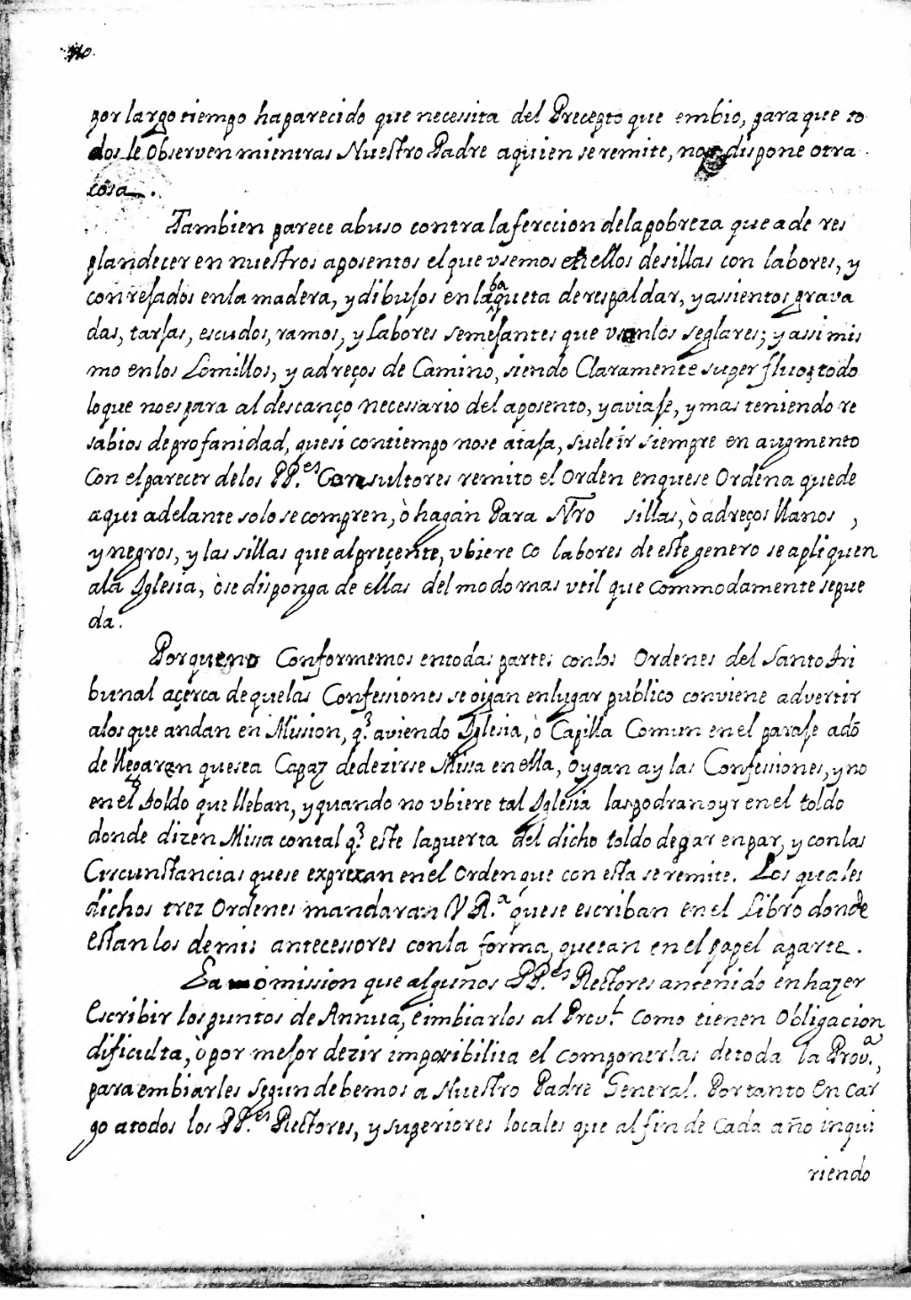 Tambien parece abuso contra la [per]ferccion de la pobreza que a de resplandecer en nuestros aposentos el que usemos en ellos de sillas con labores, y con rejados en la madera, y dibujos en la baqueta de respaldar, y assientos gravadas, tarjas, escudos, ramos, y labores semejantes que usan los seglares; y assi mismo en los lomillos, y adreços de camino, siendo claramente superfluos todo lo que no es para al descanço necessario del aposento, y a viaje, y mas teniendo resabios de profanidad, que si con tiempo no se ataja, suele ir siempre en augmento con el parecer de los Pes. Consultores remito el orden en que se ordena que de aqui en adelante solo se compren, ò hagan para n[osot]ro[s] sillas, ò adreços llanos, y negros, y las sillas que al preçente, ubiere co[n] labores de este genero se apliquen a la Iglesia, ò se disponga de ellas al modo mas util que comodamente se que da.