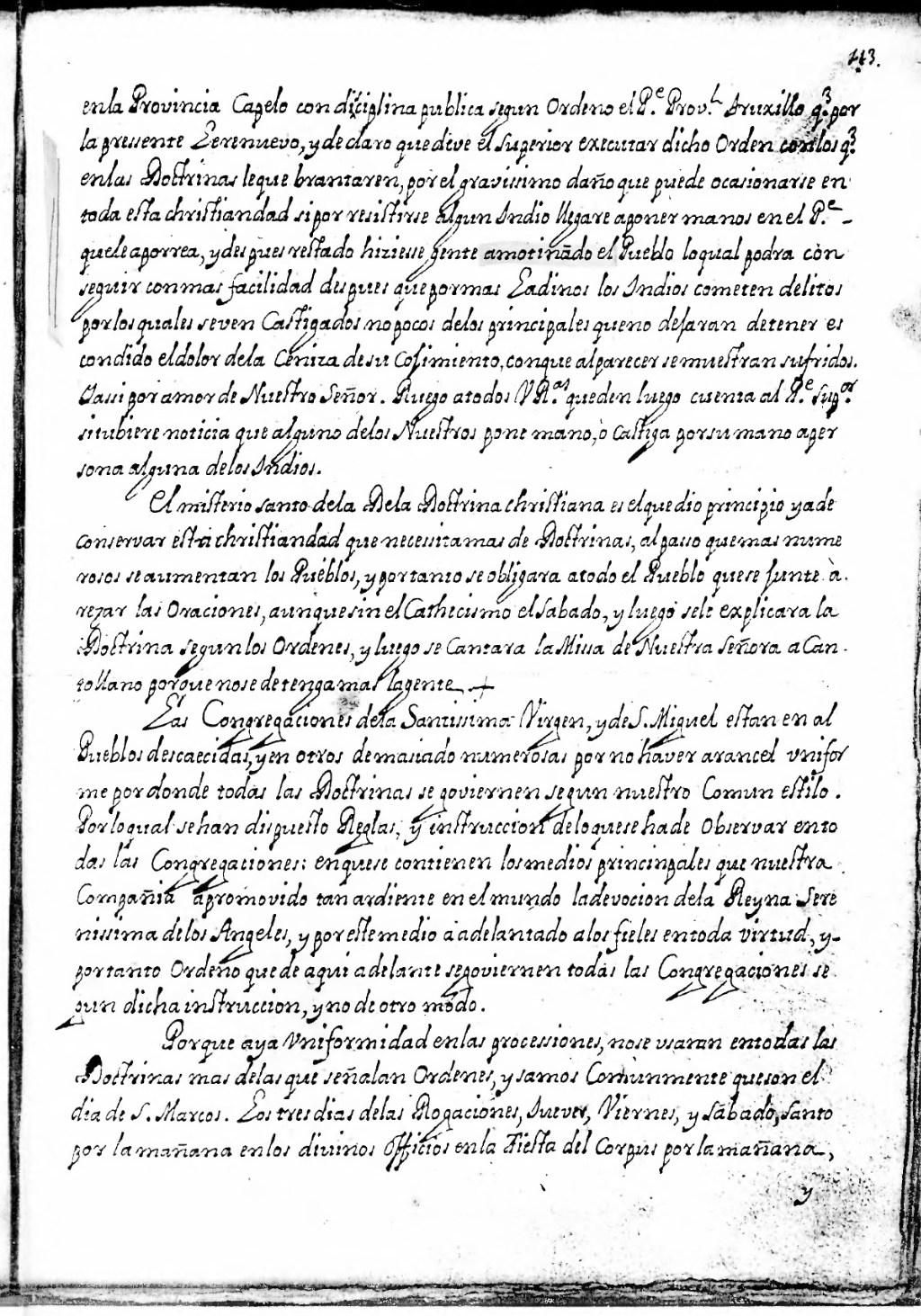 en la Provincia Capelo con disciplina publica segun ordeno el Pe. Prov.l Truxillo[1] q[u]e por la presente le renuevo, y declaro que deve el Superior executar dicho orden con los q[u]e en las Doctrinas le quebrantaren, por el gravissimo daño que puede ocasionarse en toda esta christiandad si por resistirse algun indio llegare a poner manos en el p[adr]e que le aporrea, y despues restado hiziesse gente amotina[n]do el Pueblo lo qual podra conseguir con mas facilidad despues que por mas ladinos los indios cometen delitos por los quales se ven castigados no pocos de los principales que no dejaran de tener escondido el dolor de la ceniza de su cosimiento, con que al parecer se muestran sufridos. Y assi por amor de Nuestro Señor ruego a todas V. R.as que den luego cuenta al Pe. Sup.or si tubiere noticia que alguno de los nuestros pone mano, ò castiga por su mano a persona alguna de los indios.