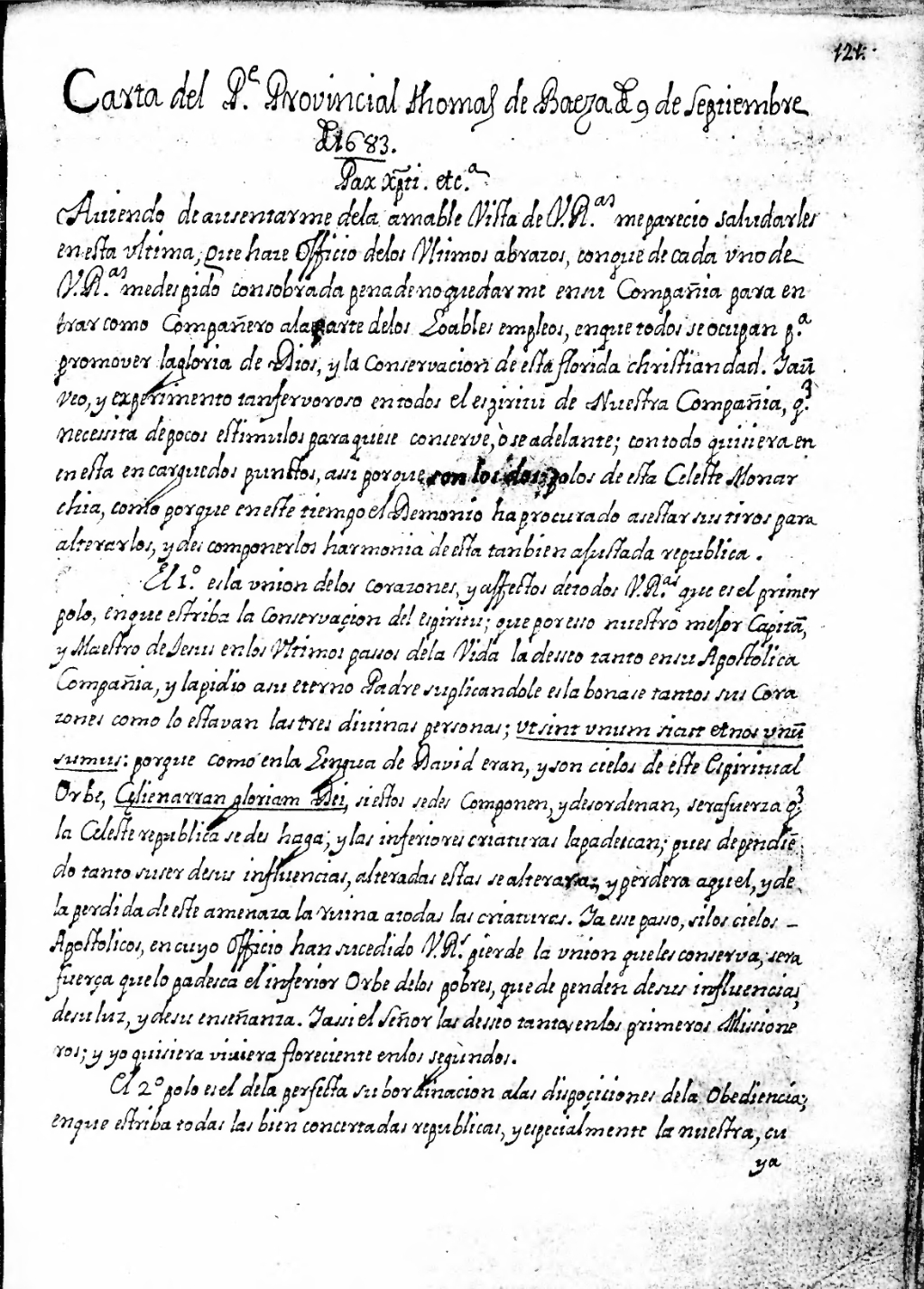 Aviendo de ausentarme de la amable vista de V. R.as me parecio saludarles en esta ultima; que haze officio de los ultimos abrazos, con que cada uno de V. R.as me despido con sobrada pena de no quedarme en su compañia para entrar como compañero a la parte de los loables empleos, en que todos se ocupan p[ar]a promover la gloria de Dios, y la conversion de esta florida christiandad. Y au[n] veo, y experimento tan fervoroso en todo el espiritu de Nuestra Compañia, q[u]e necessita de pocos estimulos para que se conserve, ò se adelante; con todo quisiera en esta encargue dos puntos, assi porque son los dos polos de esta celeste monarquia, como porque en este tiempo el Demonio ha procurado asestar sus tiros para alterarlos, y descomponer las [sic] harmonia de esta tan bien ajustada republica.