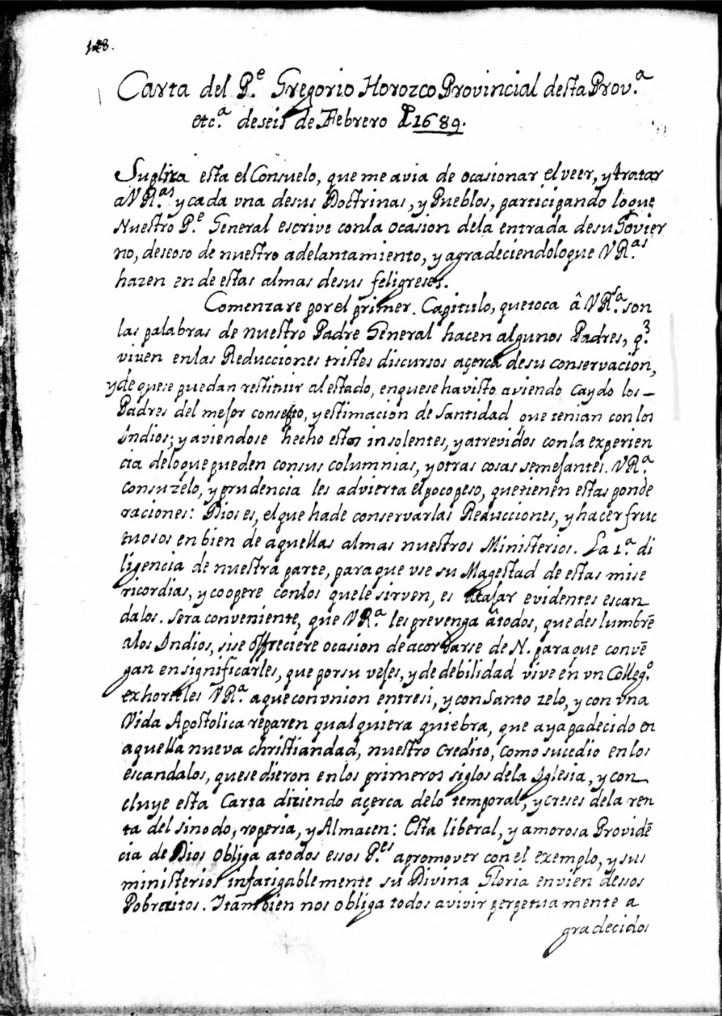 Suplira esta el consuelo, que me avia de ocassionar el veer, y tratar a V. R.as y a cada una de sus Doctrinas, y Pueblos, participando lo que Nuestro Pe. General[2] escrive con la ocasion de la entrada de su govierno, deseoso de nuestro adelantamiento, y agradeciendo lo que V. R.as hazen en [favor] de estas almas de sus feligreses.