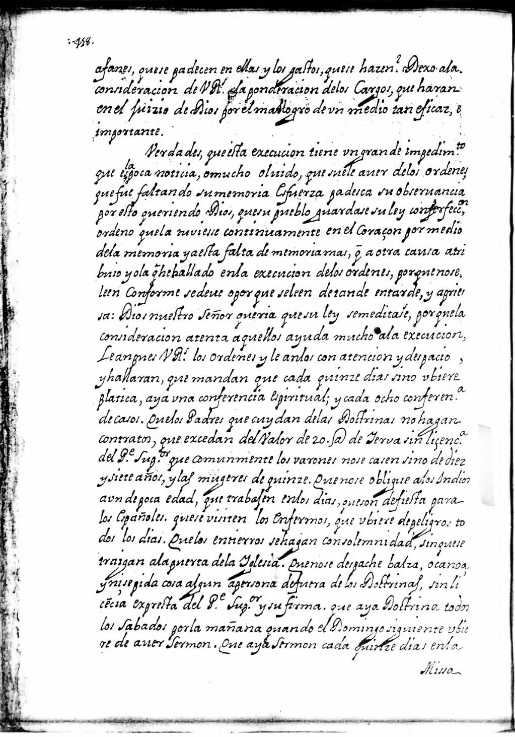 Verdad es, que esta execucion tiene un grande impedim[ien]to que es la poca noticia, o mucho oluido, que suele auer de los ordenes que fue faltando su memoria. Es fuerza padesca su obseruancia por esto queriendo Dios, que su Pueblo guardase su ley con perfecc[i]on, ordeno que la tuviesse continuamente en el coraçon por medio de la memoria y a esta falta de memoria mas, q[u]e a otra causa atribuio yo la q[u]e he hallado en la execucion de los ordenes, porque no se leen conforme se deue o porque se leen de tande [sic] en tarde, y a priessa: Dios nuestro Señor queria que su ley se meditasse, por que la consideracion atenta [a] aquellos ayuda mucho a la execución. Lean pues V. R.s los ordenes y lean los con atencion y despacio, y hallaran, que mandan que cada quinze dias sino ubiere platica, aya una conferencia espiritual; y cada ocho conferen[ci]a de casos. Que los Padres que cuydadn de las Doctrinas no hagan contratos, que excedan el Valor de 20 [arrobas] de yerba sin liçenc[i]a del Pe. Sup.or; que comunmente los varones no se casen sino de diez y siete años, y las mugeres de quinze[1]. Que no se obligue a los indios aun de poca edad, que trabajen en los dias, que son de fiesta para los españoles que se visiten los enfermos, que ubiere de peligro todos los dias. Que los entierros se hagan con solemnidad, sin que se traigan a la puerta de la Iglesia. Que no se despache balza, o canoa y ni se pida cosa algun[a] a persona de fuera de los [sic] Doctrinas, sin licencia expressa del Pe. Sup.or y su firma. Que aya Doctrina todos los sabados por la mañana quando el domingo siguiente ubiere de aver sermon. Que aya Sermon cada quinze dias en la