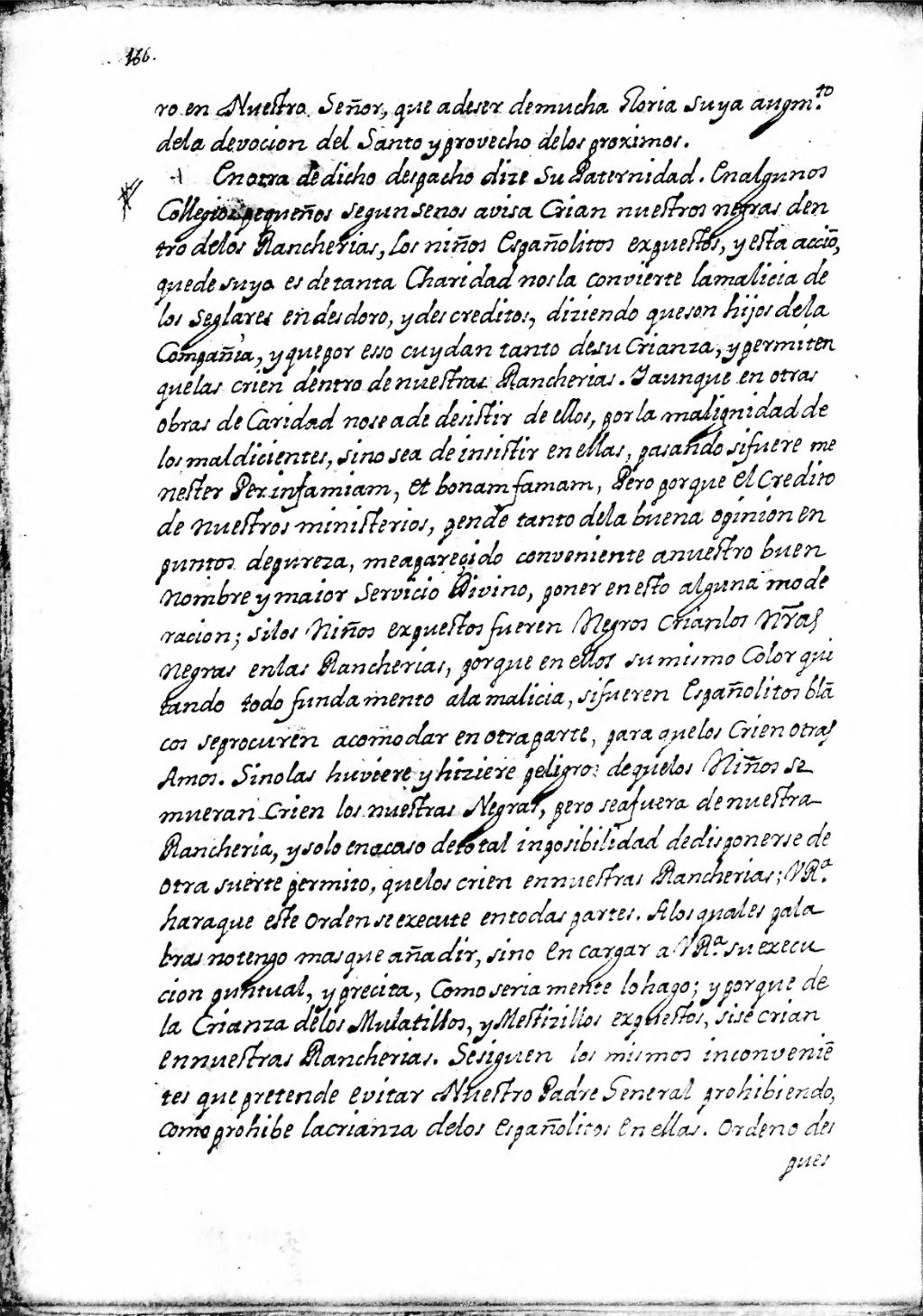 En otra de dicho despacho dize Su Paternidad. En algunos Collegios pequeños segun se nos avisa crian nuestras negras dentro de las rancherias, los niños españolitos expuestos, y esta accio[n], que de suya es de tanta charidad nos la convierte la malicia de los seglares en desdoro, y descreditos, diziendo que son hijos de la Compañia, y que por esso cuydan tanto de su crianza, y permiten que las crien dentro de nuestras rancherias. Y aunque en otras obras de caridad no se a de desistir de ellos, por la malignidad de los maldicientes, sino se a de insistir en ellas, pasando si fuere menester per infamiam, et bonam famam, pero porque el credito de nuestros ministerios, pende tanto de la buena opinion en puntos de pureza, me a parecido conveniente a nuestro buen nombre y maior servicio divino, poner en esto alguna moderacion; si los niños expuestos fueren negros crianlos n[uest]ras negras en las rancherias, porque en ellos su mismo color quitando todo fundamento a la malicia, si fueren españolitos bla[n]cos se procuren acomodar en otra parte, para que los crien otras amas. Si no las huviere e hiziere peligro de que los niños se mueran crienlos nuestras negras, pero sea fuera de nuestra rancheria, y solo en acaso de total inposibilidad de disponerse de otra suerte permito, que los crien en nuestras rancherias; V. R.a hara que este orden se execute en todas partes. A los quales palabras no tengo mas que añadir, sino encargar a V. R.a su execucion puntual, y precita, como seriamente lo hago; y porque de la crianza de los mulatillos, y mestizillos expuestos, si se crian en nuestras rancherias se siguen los mismos inconvenie[n]tes que pretende evitar Nuestro Padre General prohibiendo, como prohibe la crianza de los españolitos en ellas. Ordeno des-