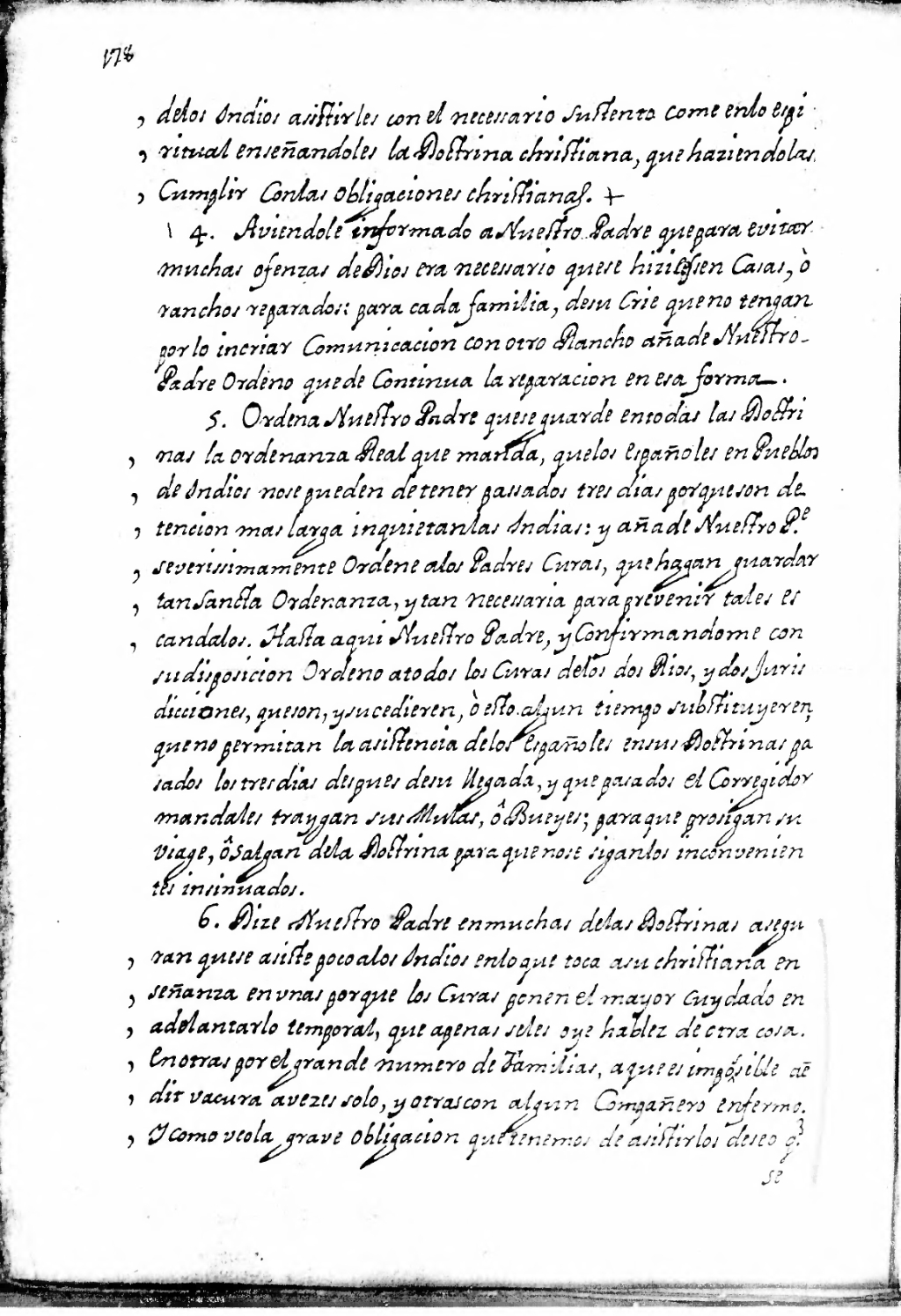 6. Dize Nuestro Padre en muchas de las Doctrinas aseguran que se asiste poco a los indios en lo que toca a su christiana enseñanza en unas porque los Curas ponen el mayor cuydado en adelantar lo temporal, que apenas se les oye hablez de otra cosa. En otras por el grande numero de familias, aque es impossible acudir [?] va cura a vezes solo, y otras con algun Compañero enfermo. Y como veo la grave obligacion que tenemos de asistirlos deseo q[u]e