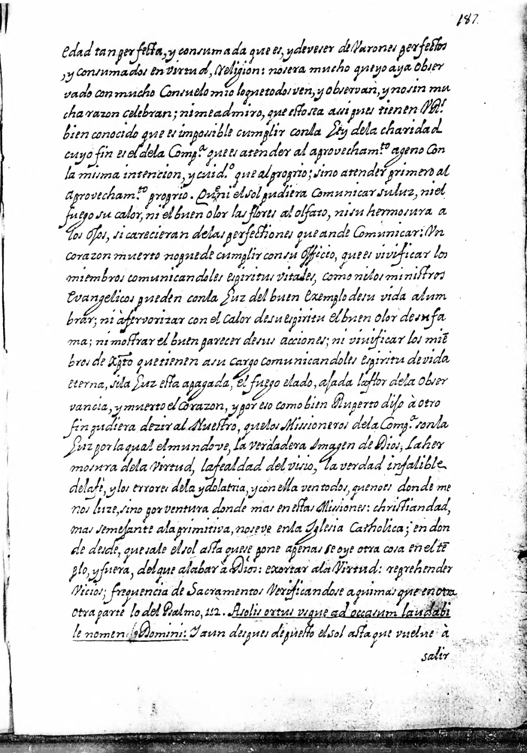 edad tan perfecta, y consumada que es, y deve ser de varones perfectos y consumados en virtud, religion: no sera mucho que yo aya observado con mucho consuelo mio lo que todos ven, y observan y no sin mucha razon celebran; ni me admiro, que esto sea assi pues tiene V. R.s bien conocido que es imposible cumplir con la ley de la charidad cuyo fin es el de la Comp[añi]a que es atender al aprovecham[ien]to ageno con la misma intencion, y cuid[ad]o que al proprio; si no atender primero al aprovecham[ien]to proprio. Que ni el sol pudiera comunicar su luz, ni el fuego su calor, ni el buen olor las flores al olfato, ni su hermosura a los ojos, si carecieran de las perfectiones que an de comunicar: Un corazon muerto no puede cumplir con su officio, que es vivificar los miembros comunicandoles espiritus vitales, como ni los ministros evangelicos pueden con la luz del buen exemplo de su vida alumbrar; ni àfervorizar con el calor de su espiritu el buen olor de su fama, ni mostrar el buen parecer de sus acciones, ni viuificar los mie[m]bros de Xpto que tienen a su cargo comunicandoles espiritu de vida eterna, si la luz esta apagada, el fuego elado, ajada la flor de la observancia, y muerto el corazon, y por eso como bien Ruperto dijo à otro fin pudiera dezir al Nuestro, que los Missioneros de la Comp[añi]a son la luz por la qual el mundo ve, la verdadera Imagen de Dios, la hermosura de la virtud, la fealdad del visio, la verdad infalible de la fé, y los errores de la ydolatria, y con ella ven todos, que no es donde menos luze, sino por ventura donde mas en estas Missiones; christiandad, mas semejante a la primitiva, no se ve en la Iglesia Catholica; en donde desde, que sale el sol asta que se pone apenas se oye otra cosa en el te[m]plo, y fuera, del que alabar à Dios, exortar a la virtud, reprehender vicios, frequencia de sacramentos[1] verificandose aqui mas que en otra otra [sic] parte lo del Psalmo, 112. A solis ortus usgne ad occasum laudabile nomen Domini[2]. Y aun despues de puesto el sol asta que vuelve à