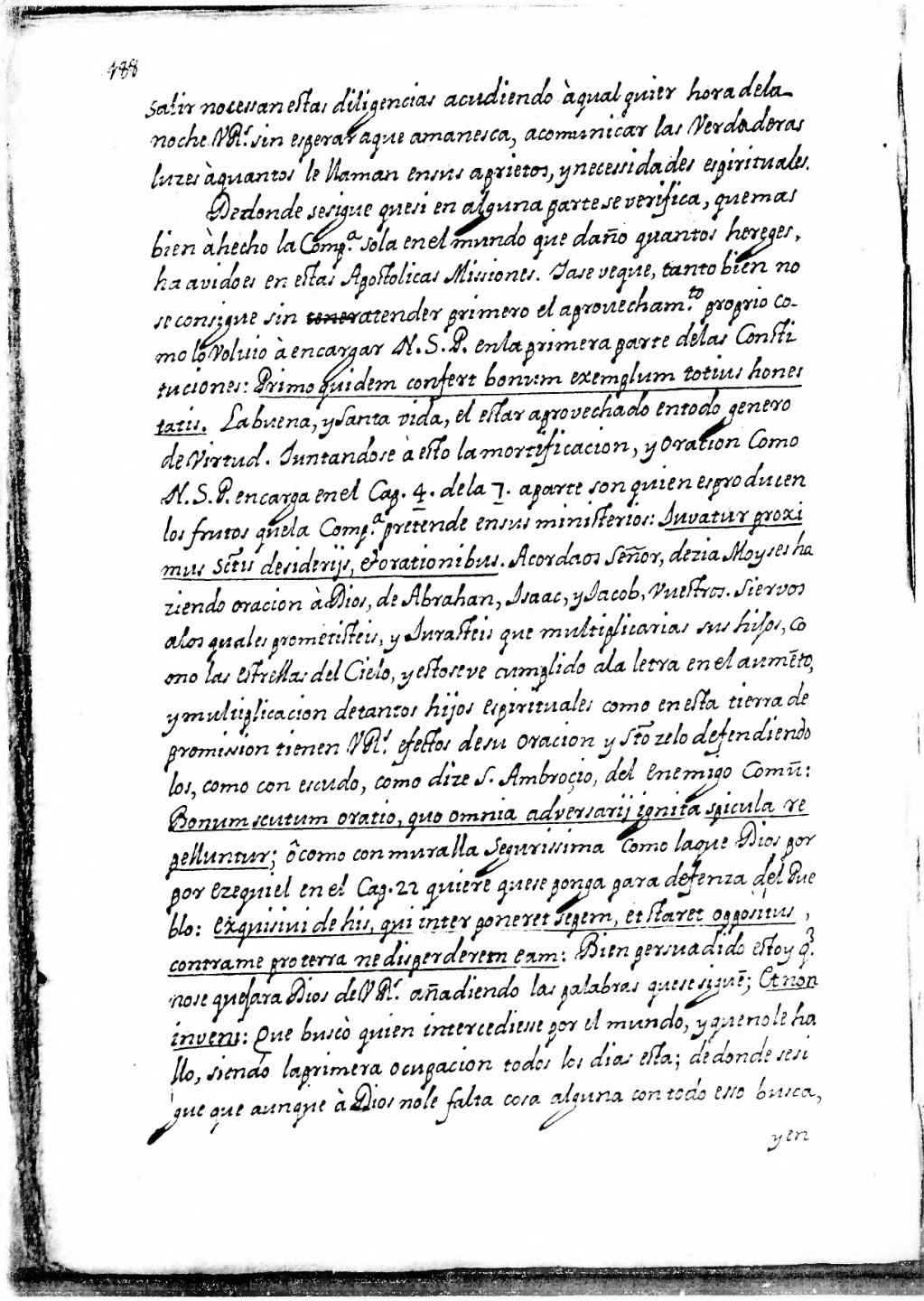De donde se sigue que si en alguna parte se verifica, que mas bien à hecho la Comp[añi]a sola en el mundo que daño quantos hereges, ha avido es [sic] en estas Apostolicas Missiones[1]. Ya se ve que, tanto bien no se consigue sin atender primero el aprouecham[ien]to proprio como la volvio à encargar N. S. P. en la primera parte de las Constituciones: Primo quidem confert bonum exemplum totius honestatis[2]. La buena, y santa vida, el estar aprovechado en todo genero de virtud. Juntandose à esto la mortificacion, y oracion como N. S. P. encarga en el Cap. 4 de la 7; a parte son quienes producen los frutos que la Comp[añi]a pretende en sus ministerios: Juvatur proximus s[an]ctis desiderijs, et orationibus[3]. Acordaos Señor, dezia Moyses haziendo oracion à Dios, de Abrahan, Isaac, y Jacob, vuestros siervos a los quales prometisteis y jurasteis que multiplicarias sus hijos, como las estrellas del cielo, y esto se ve cumplido a la letra en el aume[n]to, y multiplicacion de tantos hijos espirituales como en esta tierra de promission[4] tienen V. R.s efectos de su oracion y s[an]to zelo defendiendolos, como con escudo, como dize S. Ambroçio, del enemigo comu[n]: Bonum scutum oratio, quo omnia adversarij ignita spicula repelluntur; ô como con muralla segurissima como la que Dios por Ezequiel en el cap. 22 quiere que se ponga para defensa del Pueblo: Exquisiui de his, qui inter poneret sepem, et staret oppositus, contra me pro terra ne disperderem eam: Bien persuadido estoy q[u]e no se quejara Dios de V. R.s añadiendo las palabras que se sigue[n]; Et non inveni: Que buscò quien intercediesse por el mundo, y que no le hallo, siendo la primera ocupacion todos los dias esta; de donde se sigue que aunque à Dios no le falta cosa alguna con todo esso busca,