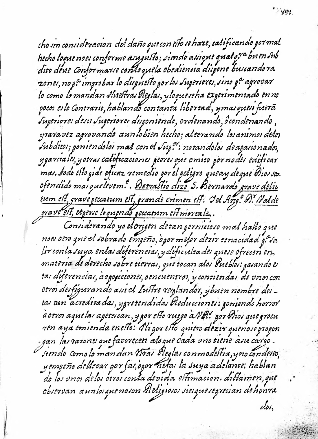 cho sin consideracion del daño que con esto se haze, calificando por mal hecho lo que no es conforme a su gusto; siendo assi que qualq[uie]ra buen subdito deue conformarse con lo que la obediencia dispone buscando razones, no p[ar]a improbar lo dispuesto por los Superiores, sino p[ar]a aprovar lo como lo mandan Nuestras Reglas, y lo que se ha experimentado en no pocos es lo contrario, hablando con tanta libertad, y mas que si fuera[n] Superiores de su[s] superiores disponiendo, ordenando, ô condenando, y rara vez aprovando aun lo bien hecho; alterando los animos de los subditos; poniendolos mal con el Sup[eri]or: notandolos de apasionados, y parciales, y otras calificaciones peores que omito por no desedificar mas, todo esto pide eficaz remedio por el peligro que ay de que Dios sea ofendido mas que levem[ent]e. Detractio dize S. Bernardo grave delictum est, grave peccatum est, grande crimen est: Y el Ang[elic]o D[octo]r Valde grave est, et perse loquendo peccatum est mortale.