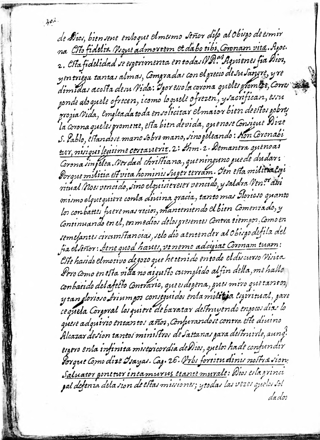 de Dios, bien se ue en lo que el mismo Señor dijo al Obispo de esmirna Esto fidelix usque ad mortem et dabo tibi, coronam vita. Apoc. 2. Esta fidelidad se esperimenta en todas V. R.as a quienes fia Dios, y entriega tantas almas, compradas con el precio de su sangre, y redimidas a costa de su vida: Y por esso la corona que les promete, corresponde a lo que le ofrecen, i como lo que le ofrezen, y sacrifican, es su propia vida, empleada toda en solicitar el maior bien de estos pobres, la corona que les promette, esta bien de vida, que no se consigue dize S. Pablo, estandose mano sobre mano, sino peleando: Non coronabitur, nisi qui legitime certauevit. 2: Thm. 2. De manera que no ai corona sin pelea, verdad christiana, que ninguno que de dudar: Porque militia est vita hominis super terram. Y en esta milicia espiritual no es vencido, sino el quisiere ser vencido, y saldra ven[ced]or assi mismo el que quiere con la divina gracia, tanto mas glorioso quanto los conbattes fueren mas recios, manteniendo el bien comenzado, y continuando en el, en medios de los presentes contratiempos, como en semejantes circunstancias, se lo dio a entender al Obispo de Filadelfia el Señor: Tene quod haues, ut nemo adcipias coronam tuam: Este ha sido el motivo de gozo que he tenido en todo el discurso visita pero como en esta vida no ai gusto cumplido al fin della, me hallo conbatido del afecto contrario, que es de pena, pues miro que tantos, y tan gloriosos triunpos conseguidos en la militia espiritual, parece que la corporal los quiere de[s]baratar destruyendo en pocos dias lo que se adquirio en tantos años, conjurandose contra este diuino Alcazar de sion tanto ministro de Sattanas para destruirle, aunq[u]e espero en la infinita misericordia de Dios, que los ha de confundir porque como dice Isayas. Cap. 26. Urbs fortitudinis sotra Sion: Salvator ponetur in ea murus et ante murale: Dios es la principal defensa de la sion de estas missiones; y todas las veces que los sol-