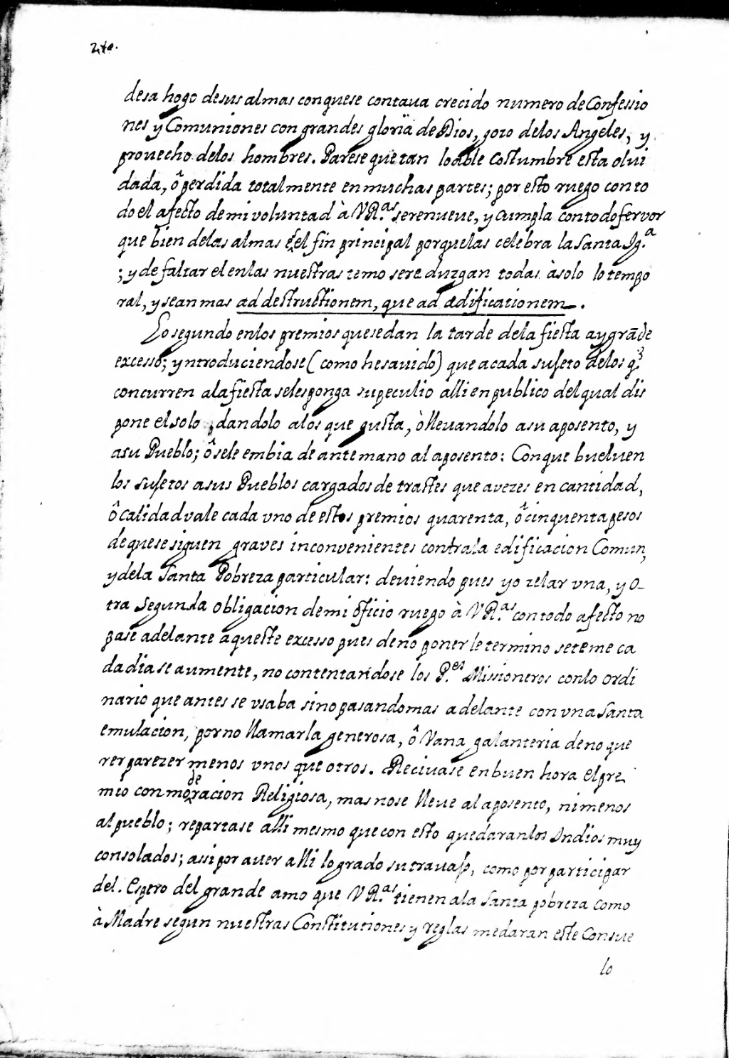 desahogo de sus almas con que se contava crecido el numero de confesiones y comuniones con grandes gloria de Dios, gozo de los Angeles, y provecho de los hombres. Parece que tan loable costumbre esta oluidada, ô perdida totalmente en muchas partes; por esto ruego con todo el afecto de mi voluntad a V. R.as se renueve, y cumpla con todo fervor que bien de las almas es el fin principal porque las celebra la Santa Ig[lesi]a; y de faltar el en las nuestras temo se reduzgan todas à solo lo temporal y sean mas ad destructionem, que ad aedificationem.