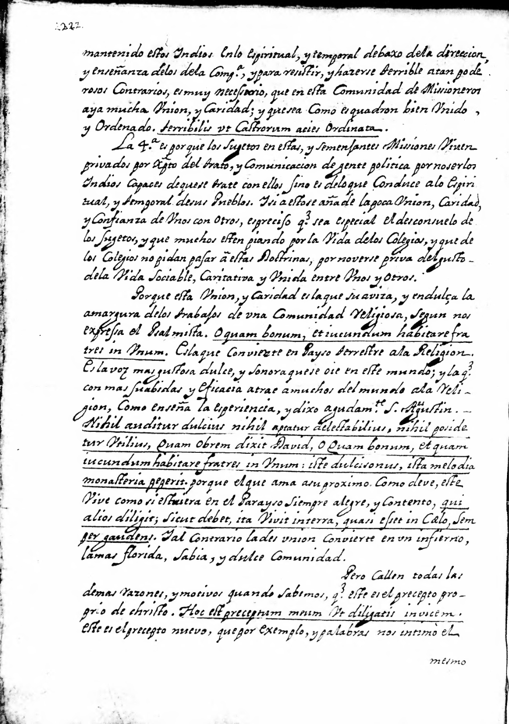 mantenido estos indios en lo espiritual, y temporal debaxo de la direccion y enseñanza de los de la Comp[añi]a, y para resistir, y hacerse terrible a tan poderosos contrarios, es muy necesario, que en esta Comunidad de Missioneros aya mucha union, y caridad; y que sea como esquadron bien unido, y ordenado. Terribilis ut castrorum acies ordinata[1][2].