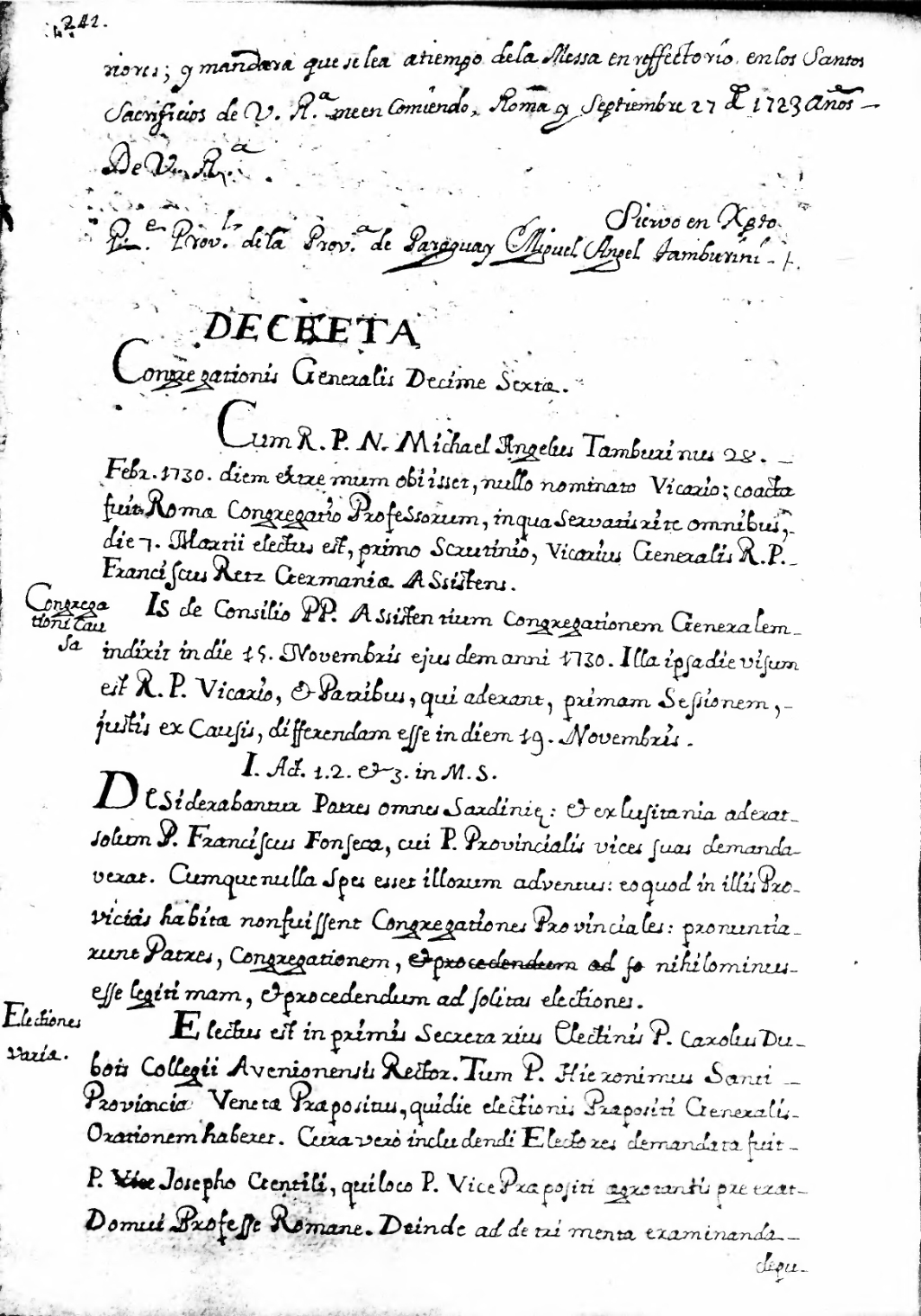 riores; y mandara que se lea a tiempo de la missa en reffectorio; en los santos sacrificios de V. R.a me encomiendo. Roma y septiembre 27 de 1723 años. De V. R.a, siervo en Xp[is]to. Pe. Prov.l de la Prov[inci]a de Paraguay. Miguel Angel Tamburini