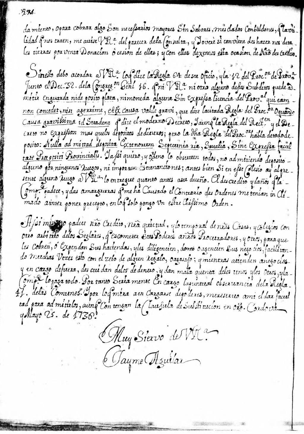 Sin esto debo acordar a V. R.a lo q[u]e dize la Regla 64 de su oficio[1], y la 12 del Proc[urad]or de Prov[inci]a[2] junto al Dec[reto] 32 de la Congreg[aci]on Gen[nera]l 16[3] q[u]e ni V. R.a, ni otro alguno de sus subditos puede admitir en guarda ni deposito plata, ni moneda alguna sin expressa licencia del Prov[inci]al qui eam non concedet, nisi agerrime, et ex causa valde gravi, que dize la citada Regla del Proc[ura]dor O quando causa gravissima id suadent q[u]e dize el moderno decreto, y aunq[u]e la Regla del Rect[or] en y el decreto no espressan mas que los depositos de dineros; pero la d[ic]ha Regla del Proc[urad]or habla de todo deposito: Nulla ad mittad deposita extenorum se pecuniaria, se ualia, sine expresa facultate Praepositi Provincialis. Y assi quiero, y ordeno lo observen todos, no admitiendo deposito alguno por ningunos ruegos, ni importunaciones; antes bien, si en esse Colesio ay al presente alguno ruego a V. R.a lo entregue quanto antes a su dueño. El descredito y daños q[u]e la Comp[añi]a padece, y das amargruras q[u]e me ha causado el contrario desordenes me tenian inclinado a interponer precepto, en lo q[u]e solo pongo un estrechissimo orden.