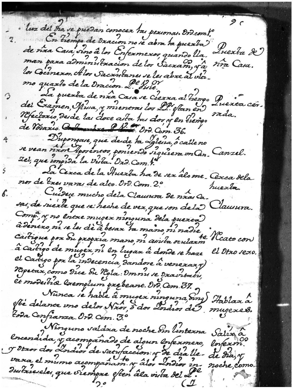 [9]6. Cuidese mucho de la clasura de n[uest]ras casas, de suerte que se heche de ver, que son de la Comp[añi]a, y no entre muger ninguna de la puerta â dentro, ni se les dè â besar la mano, ni nadie castigue por su propria mano, ni assista ocultam[en]te â castigo por la indecencia, dandose â venerar, y respetar, como dice su regla: Omnis se gravitatis, et modestiae exemplum praebeant, Ord[en] com[un] 37[10].