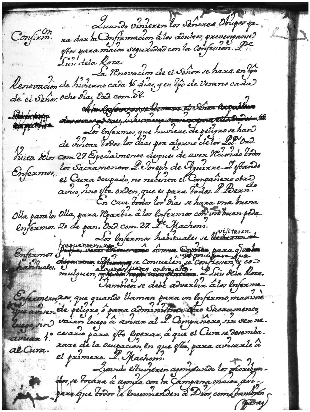 [8]Los enfermos habituales se visitaran[9] frequentemente para q[ue] se consuelen, y se procurara que se se condiessen, y comulguen algunas veces entre año [?]. P. Luis de la Roca.