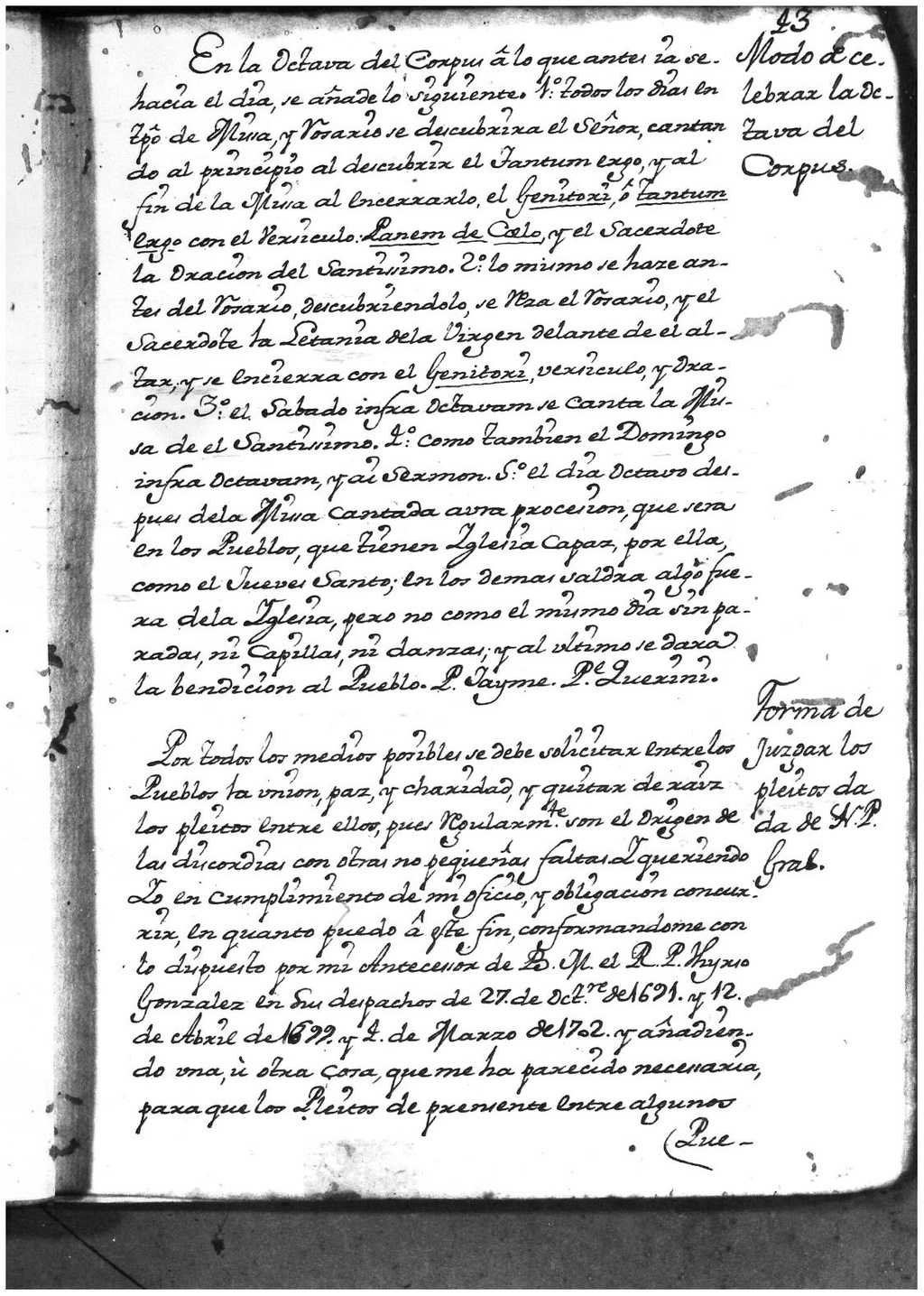 [1]en la Ocatva del Corpus â lo que antes ia se hacia el dia, se añade lo siguiente. 1o: todos los dias en t[iem]po de missa, y rosario se descubrira el Señor, cantando al principio al descubrir el Tantum ergo, y al fin de la missa al encerrarlo, el Genitori, ô Tantum ergo con el versiculo: Panem de caelo, y el sacerdote la oracion del Santissimo. 2o: lo mismo se haze antes del rosario, descubriendolo, se reza el rosario, y el sacerdote la letania de la Virgen delante de el altar, y se encierra con el Genitori, versiculo, y oracion. 3o: el sabado infra octavam se canta la missa de el Santissimo. 4o: como tambien el domingo infra octavam, y ai sermon. 5o: el dia octavo despues de la missa cantada avra procesion, que sera en los Pueblos, que tienen Iglesia capaz, por ella, como el Jueves Santo; en los demas saldra algo fuera de la Iglesia, pero no como el mismo dia sin paradas, ni capillas, ni danzas; y al ultimo se dara la benedicion al Pueblos. P. Jayme. Pe. Querini.