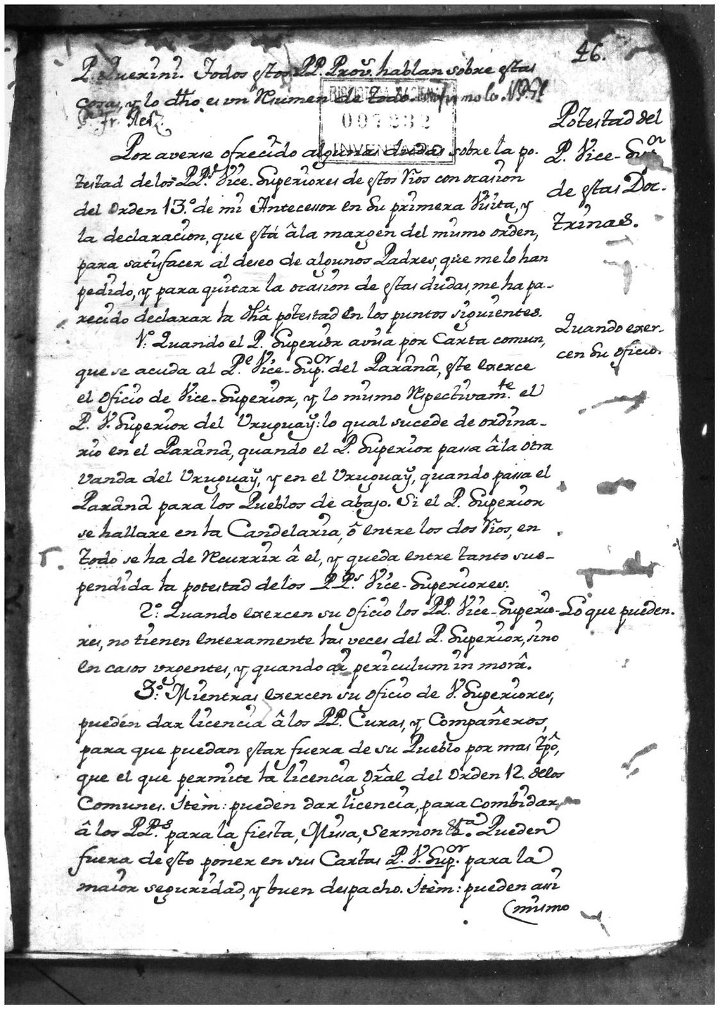 3o: Mientras exercen su oficio de V[ice]-Superiores, pueden dar licencia â los PP. Curas, y compañeros para que puedan estar fuera de su Pueblo por mas t[iem]po, que el que permite la licencia g[ene]ral del Orden 12 de los comunes. Item: pueden dar licencia para combidar â los PPs. para la fiesta, missa, sermon, etc. Pueden fuera de esto poner en sus cartas P. V[ice]-Sup[eri]or para la maior seguridad, y buen despacho. Item: pueden assi-