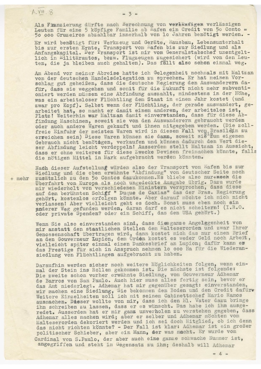 Am Abend vor meiner Abreise hatte ich Gelegenheit nochmals mit Maltzan von der deutschen Handelsdelegation zu sprechen. Er hat meinen Vor-schlag gut geheißen, dass die deutsche Regierung den Auswanderern da-für, dass sie weggehen und somit für die Zukunft nicht mehr subventi-oniert werden müssen eine Abfindung auszahlt, mindestens in der Höhe, was ein arbeitsloser Flüchtling dem Staat in einem Jahr kostet (und zwar pro Kopf). Selbst wenn der Flüchtling, der gerade auswandert, ge-arbeitet hat, so macht er damit einem anderen, der arbeitslos ist, Platz! Weiterhin war Maltzan damit erinverstanden, dass für diese Ab-findung Maschinen, soweit sie von den Auswanderern gebraucht werden oder auch andere Waren gekauft und ihnen mitgegeben werden. (Die zoll-freie Einfuhr der meisten Waren wird in diesem Fall von Brasilein zu errichen sein) Diese Waren können sie dann, soweit sie sie zum eigenen Gebrauch nicht benötigen, verkaufen und können dadurch den Wert die-ser Abfindung leicht verdoppeln! Ausserdem stellt Maltzan in Aussicht, dass er ohne weiteres für diese Zwecke Devisen freimachen könnte, falls die nötigen Mittel in Mark aufgebraucht werden könnten.