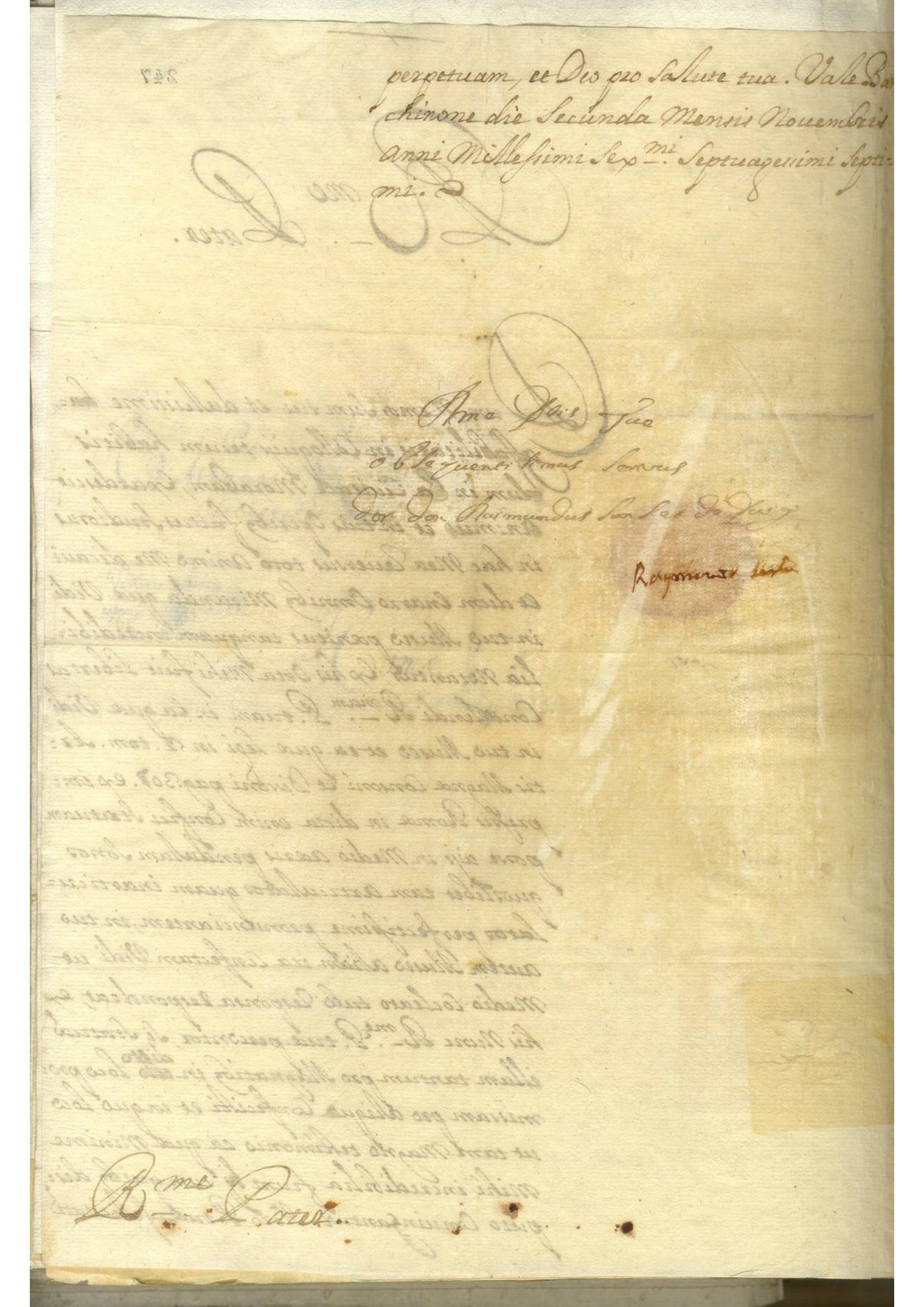 perpetuam, et Deo pro salute tua. Vale Barchinone die Secunda Mensis Novembris anni Millesimi sexcentesimi settuagesimi Septimi.