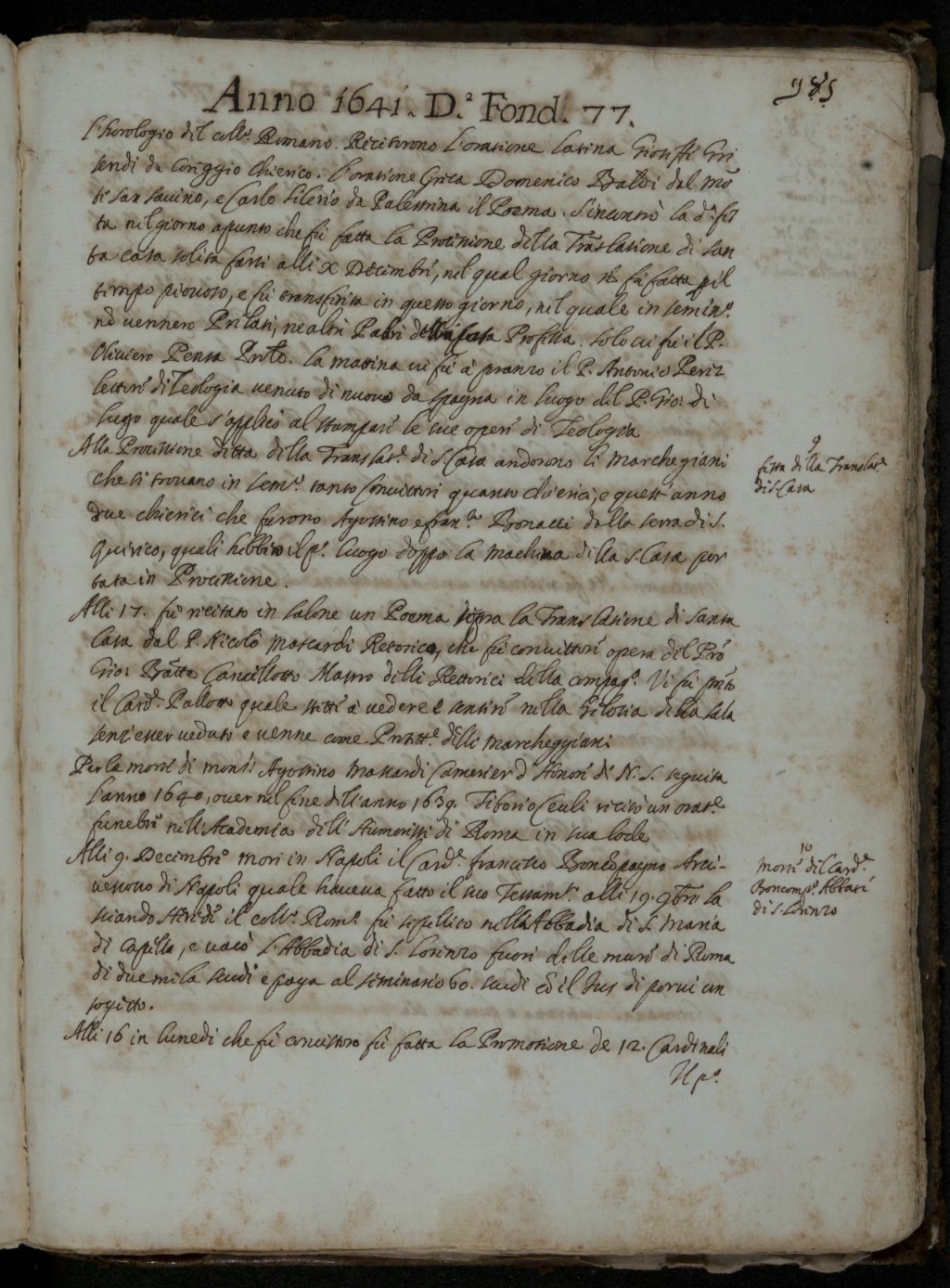 Alli 17 fu recitato in salone un Poema sopra la Translatione di Santa
