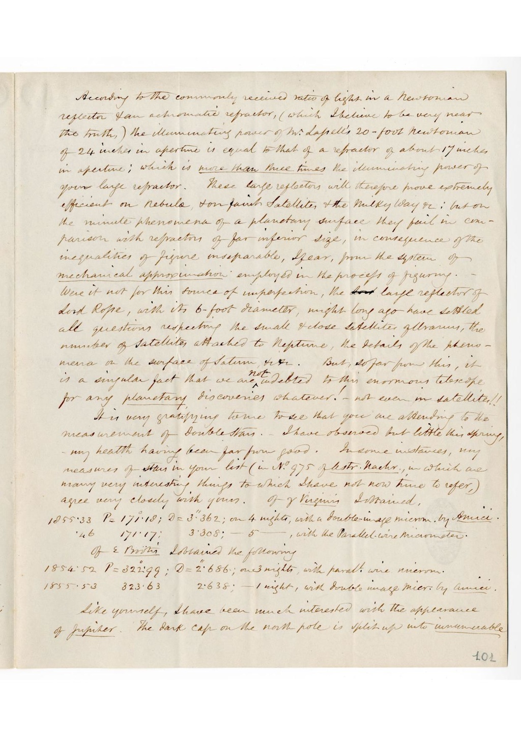 According to the commonly received ration of light in a Newtonian reflector and an automatic refractor, (which I believe to be very near the truth), the illuminating power of W. Lassell's 20-foot Newtonian of 24 inches in apertune is equal to that of a refractor of about 14 inches in aperture; which is more than three times the illuminating power of your large refractor. These large refractors will therefore prove extremely efficient on nebula, and on parish Satellite, and the Milky Way or: but on the minute phenomena of a planetary surface they fail in comparison with refractors of far inferior size, in consequence of the inequalities of figure inseparable, offear, from the system of mechanical appropination employed in the process of figuring. Were it not for this source of imperfection, the large reflector of dead Rope, with its 6-foot diameter, might long ago have settled all questions respecting the small and close satellites of Uranus, the number of satellites attached to Neptune, the details of the phenomena on the surface of Saturn, __. But, so far from this, it is a singular fact that we are not indebted to this enormous telescope for any planetary discoveries whatever! - not even in satellites!!