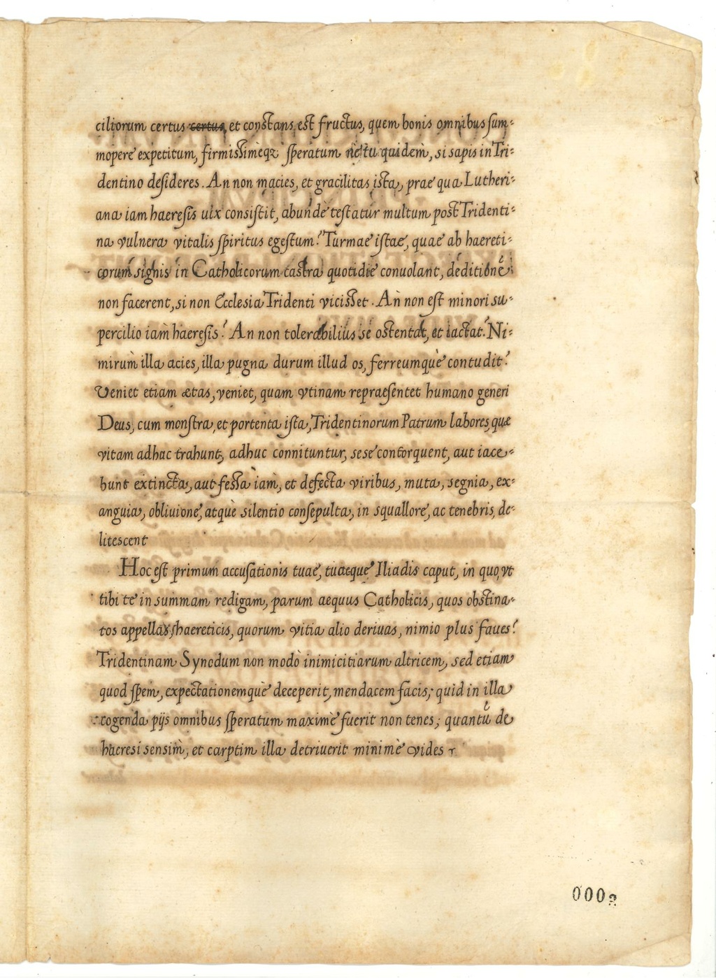 [lacuna]...ciliorum certus certus et constans est fructus, quem bonis omnibus summopere expetitum, firmissimeque speratum ne tu quidem , si sapis in Tridentino desideres. An non macies, et gracilitas ista, prae qua Lutheriana iam haeresis vix consistit, abunde testatur multum post Tridentina vulnera vitalis spiritus egestum. Turmae istae, quae ab haereticorum signis in Catholicorum castra quotidie convolant, deditione non facerent, si non Ecclesia Tridenti vicisset. An non est minori supercilio iam haeresis. An non tolerabilius se ostentant, et iactat. Nimirum illa acies, illa pugna durum illud os, ferrumque contundit. Veniet etiam aetas, venient, quam utinam repraesentet humano generi Deus, cum monstra, et portenta ista, Tridentinorum Patrum labores, quae vitam adhac trahunt, adhuc connituntur, sese contorquent, aut iacebunt extincta, aut festa iam, et defecta viribus, muta, segnia, exanguia, oblivione, atque silentio consepulta, in squallore, sc tenebris delitescent.