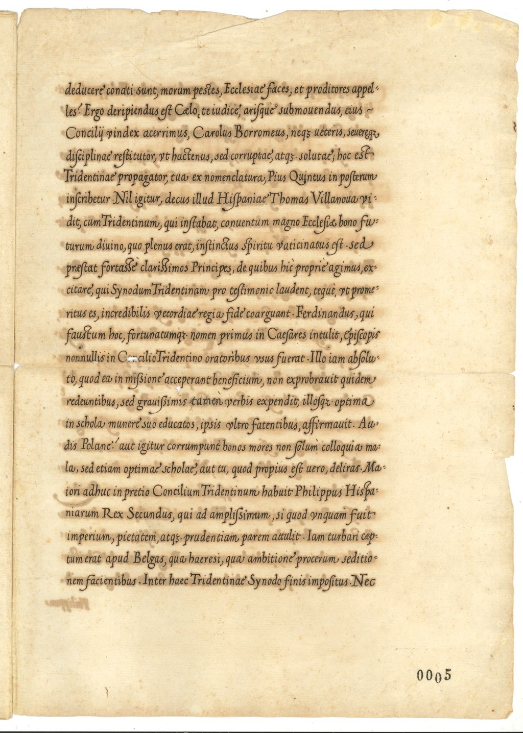 deducere conati sunt, morum pestes, Ecclesia faces, et proditores appelles. Ergo Deripendus est Caelo, te iudice, arisque submovendus, eius Consilii vindex acerrimus, Carolus Borromeus, neque veteris, severaeque disciplinae restitutor, ut hactenus, sed corruptae, atque solutae, hoc est Tridentinae propagator, tua ex nomenclatura, Pius Quintus in posterum inscribetur. Nil igitur, decus illud Hispaniae Thomas Villanova vidit, cum Tridentinum, qui instabat, conventum magno Ecclesiae bono futurum divino, quo plenus erat, instinctus spiritu vaticinatus est. Sed praestat fortasse clarissimos Principes, de quibus hic proprie agimus, excitare, qui Synodum Tridentinam pro testimonio laudent, teque, ut promeritus es, incredibilis vecordiae regia fide coarguant. Ferdinandus, qui faustum hoc, fortunatumque, nomen primus in Cesaris intulit, episcopis nonnullis in Concilio Tridentino oratoribus usus fuerat. Illo iam absoluto, quod ea in missione acceperant beneficium, non exprobravit quidem redeuntibus, sed gravissimis tamen verbis expendit, illosque optimain schola munere suo educatos, ipsis ultro fatentibus, affirmavit. Audis Polane aut igitur corrumpunt bonos mores non solum colloquia mala, sed etiam optimae scholae, aut tu, quod propius est vero, deliras. Maiori adhuc in pretio Concilium Tridentinum habuit Philippus Hispaniarum Rex Secundus, qui ad amplissimum, si quod unquam fuit imperium, pietatem, atque prudentiam parem attulit. Iam turbari caeptum erat apud Belgas, qua haeresi, qua ambitione procerum seditionem facientibus. Inter haec Tridentinae Synodo finis imposuit. Nec