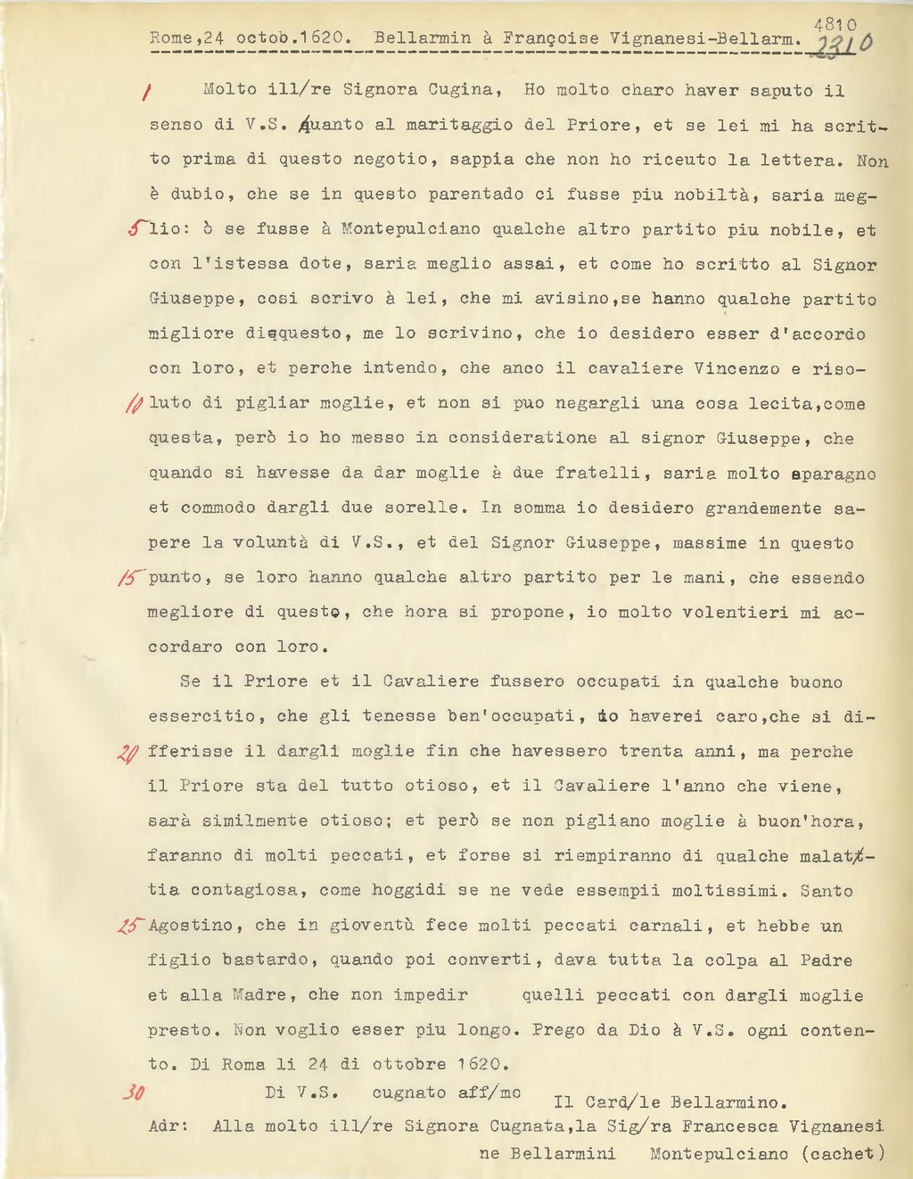 Se il Priore et il Cavaliere fussero occupati in qualche buono essercitio, che gli tenesse ben'occupati, io haverei caro, che si differisse il dargli moglie fin che havessero trenta anni, ma perche il Priore sta del tutto otioso, et il Cavaliere l'anno che viene, sarà similmente otioso; et però se non pigliano moglie à buon'hora, faranno di molti peccati, et forse si riempiranno di qualche malattia contagiosa, come hoggidi se ne vede essempii moltissimi. Santo Agostino, che in gioventù fece molti peccati carnali, et hebbe un figlio bastardo, quando poi converti, dava tutta la colpa al Padre et alla Madre, che non impedir quelli peccati con dargli moglie presto. Non voglio esser piu longo. Prego da Dio à V.S. ogni contento. Di Roma li 24 di ottobre 1620.